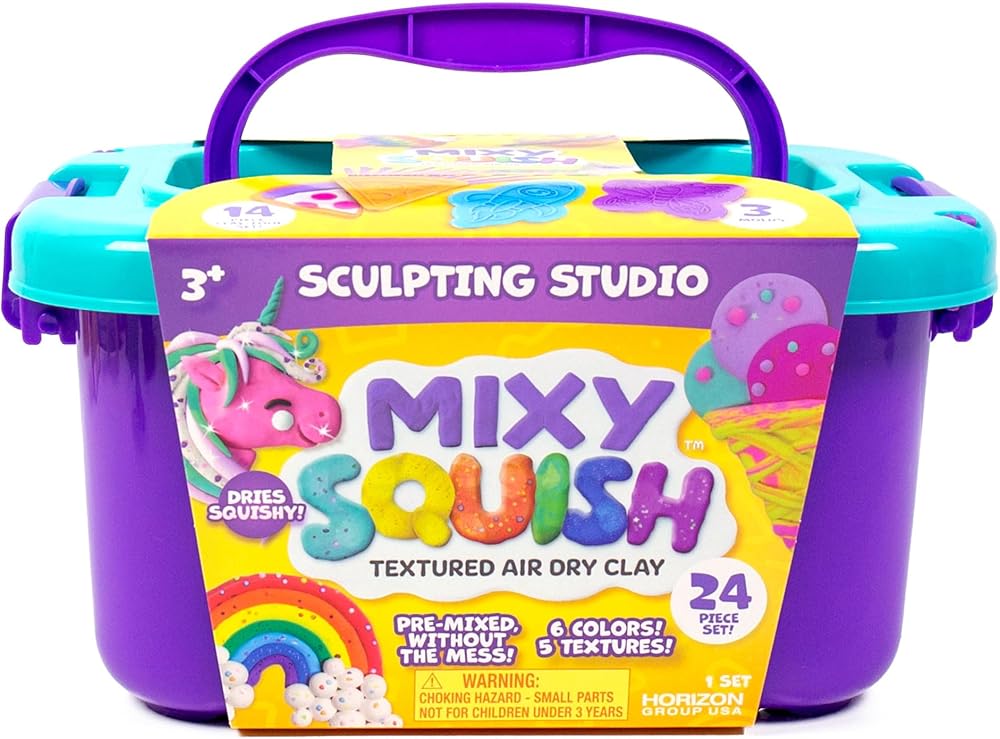 DRIES SQUISHY & SMOOTH: After 24-48 hours, your Mixy Squish masterpieces will be completely dry — without cracks or crumbling, just soft and spongy fun!.KEEP YOUR MIXY SQUISH MAGICAL: Store your clays in resealable bags or containers and keep them in a cool, dry place!.SET INCLUDES: 6 Colors of Pre-Mixed Air-Dry Clay Bags with Colorful Foam Balls and Glitter (1 oz. Each),14 Sculpting Tools, 3-Double Sided Molds (Pizza, Rocket, Butterfly), Easy-to-Follow Instructions