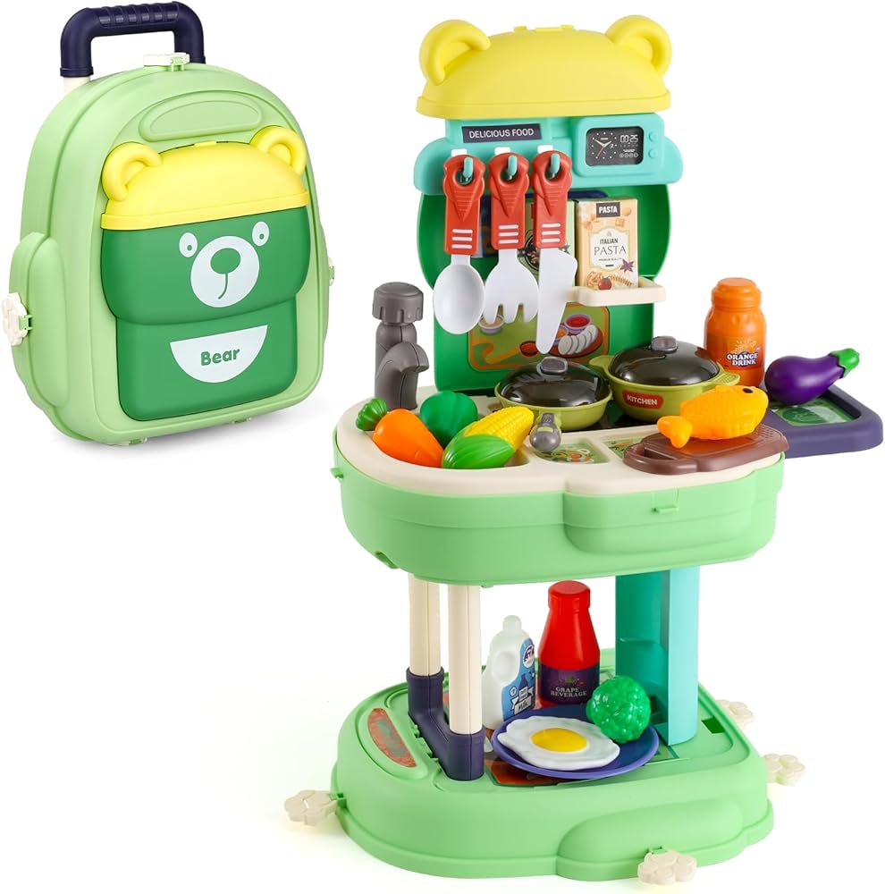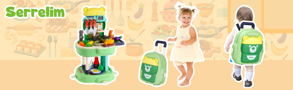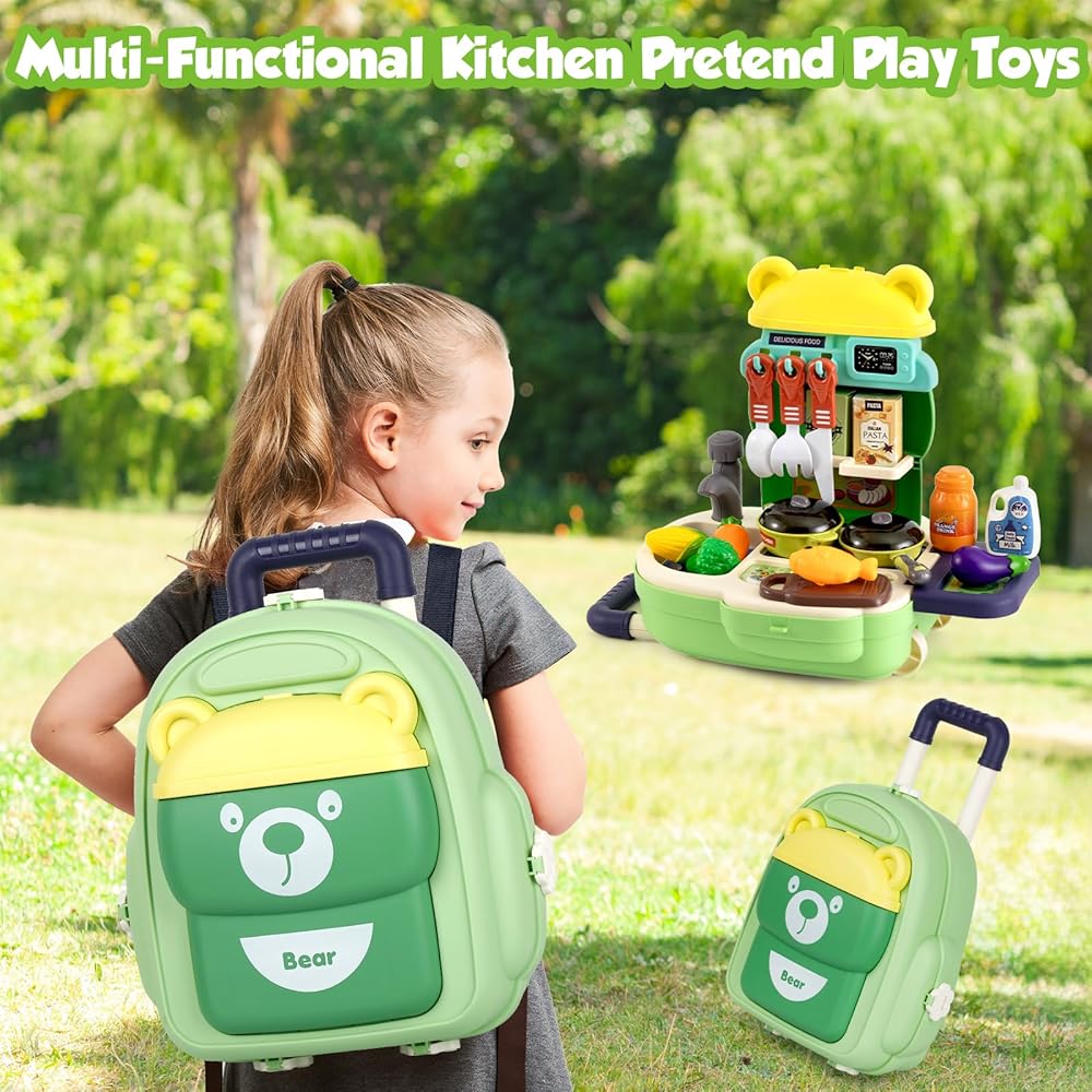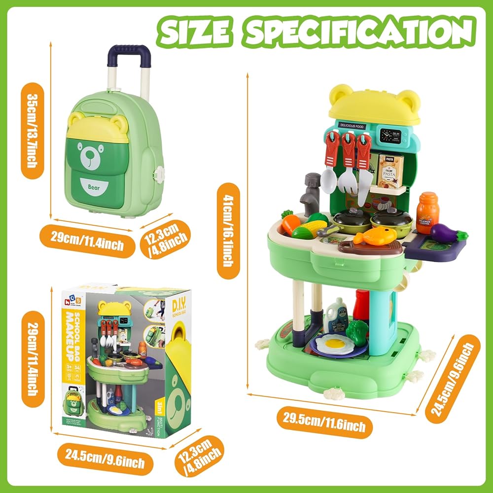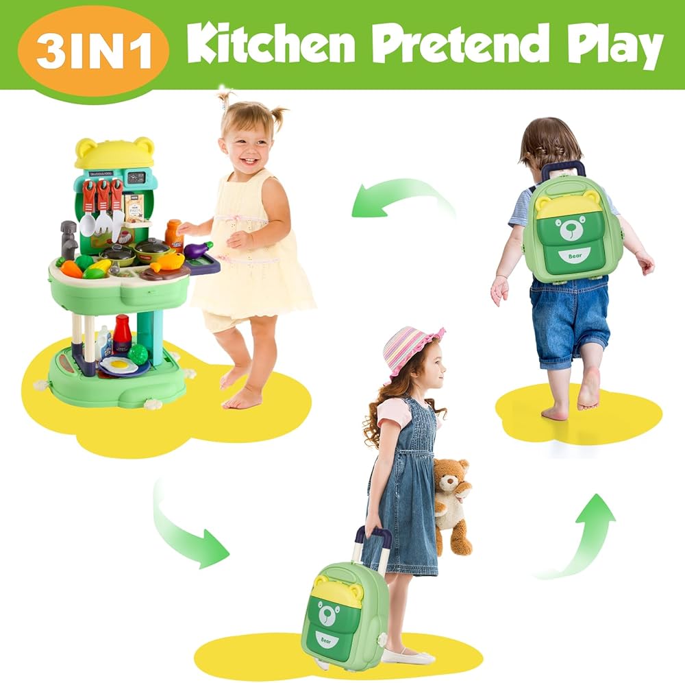 3 in 1 Kitchen Toys Set : The 3 in 1 kitchen kit can be turned to trolley case, kitchen tool bench and backpack, easy to assemble, transport and store. Switching backpack mode allows your child to carry the "mobile kitchen" on his back and enjoy the fun of simulated cooking anytime and anywhere.