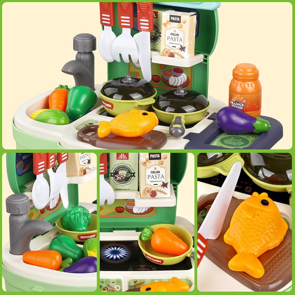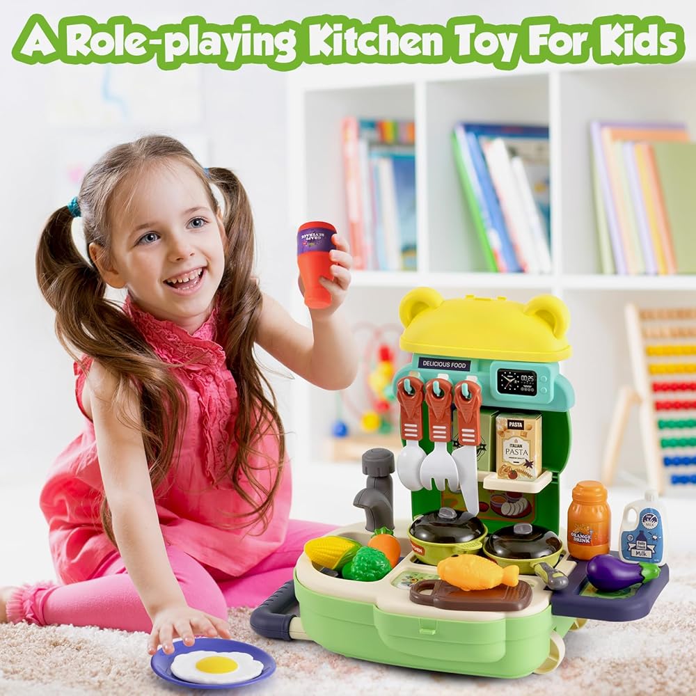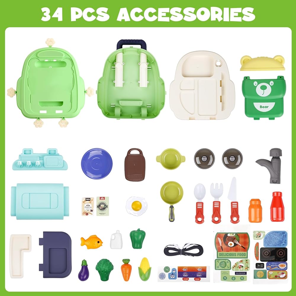 ️Kitchen Toys To Play Pretend Kitchen: This kitchen toy backpack is made of safe ABS environmental protection plastic and can be assembled into a kitchen workbench in a few minutes. For school-age children, the assembly process is full of fun. It is vivid and integrates kitchen elements such as vegetables, pots and pans, washstand and so on. Let children fully enjoy happy simulated life time.