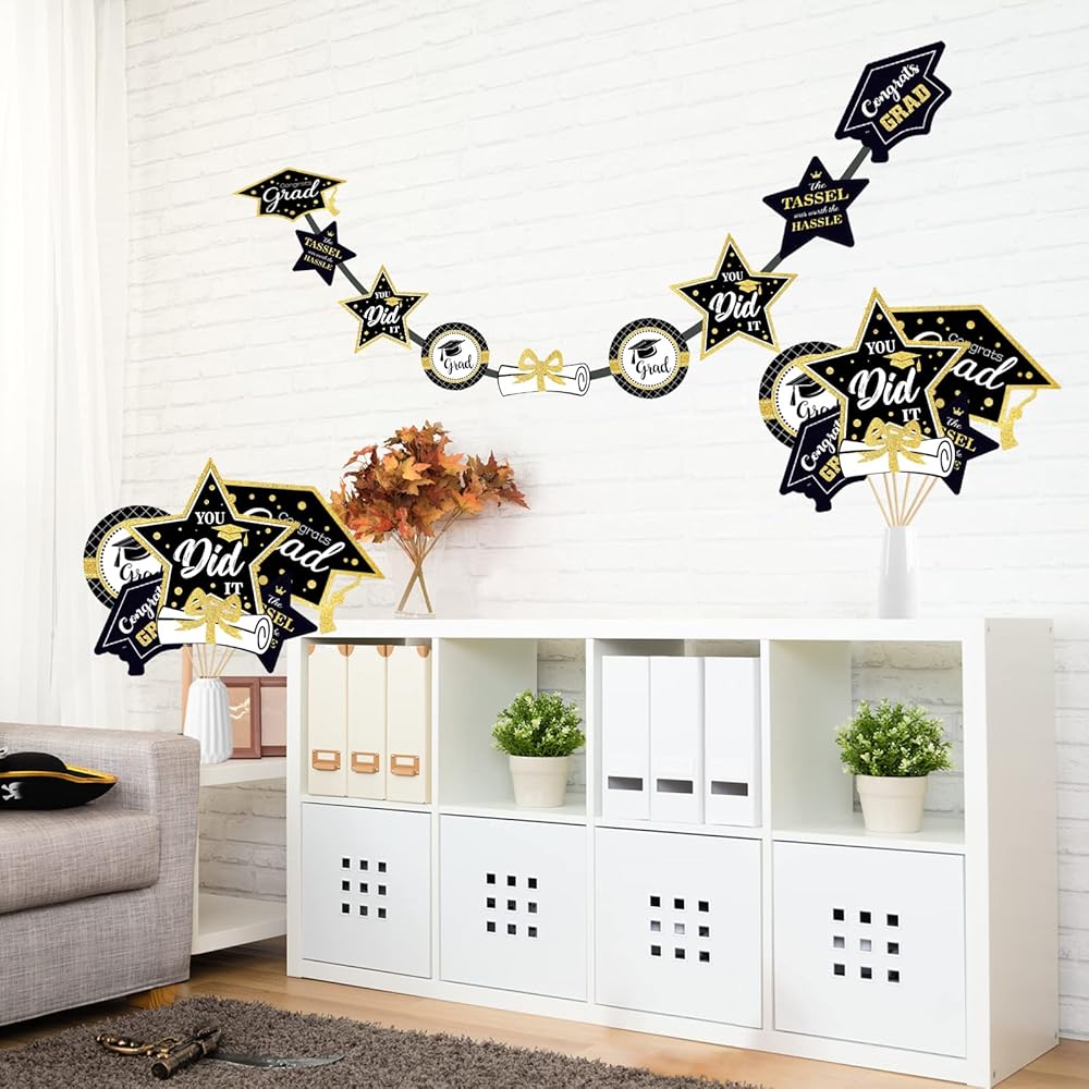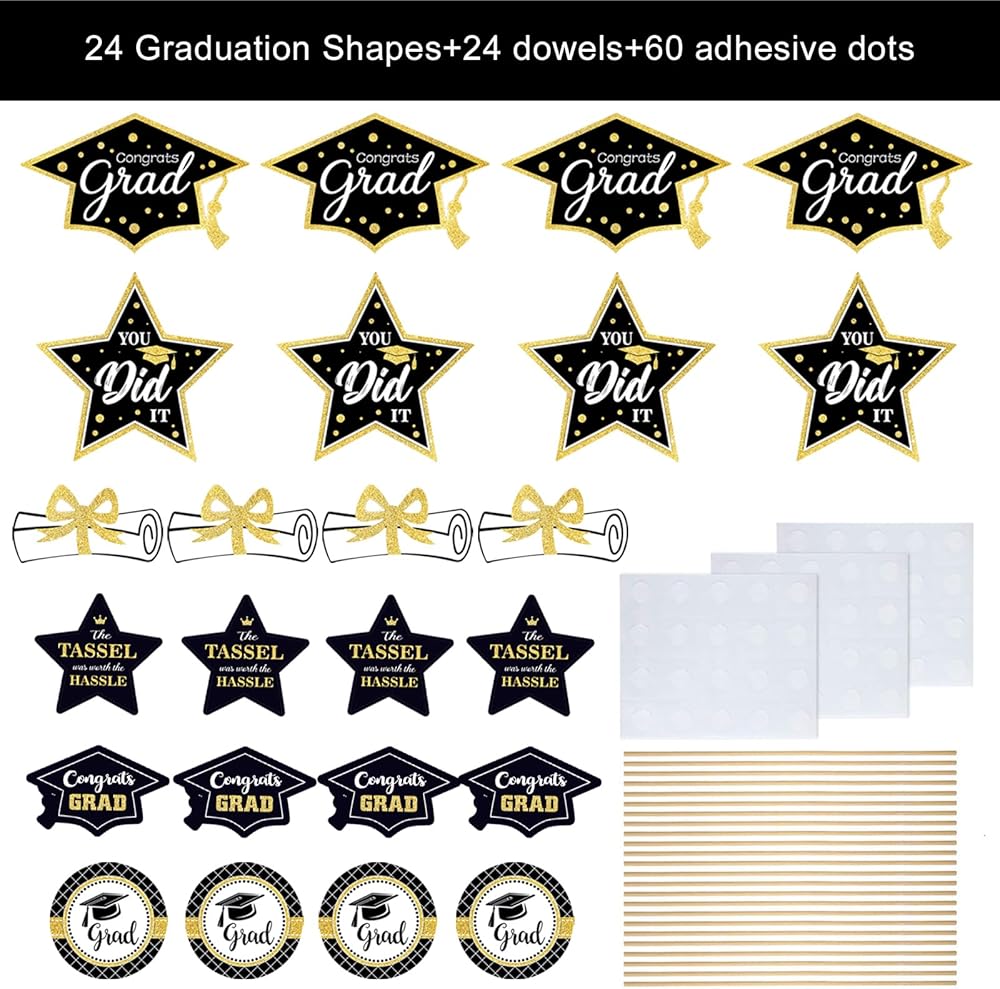 مجموعة ديكورات التخرج باللونين الأسود والذهبي، مكونة من 24 قطعة من ديكور الطاولة لعام 2024، عصي مركزية لحفلات التخرج، أغطية الطاولات، لوازم حفلات التخرج