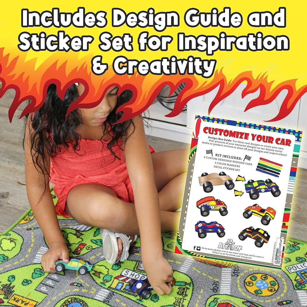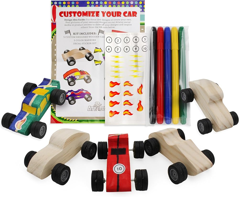 • تتضمن: خمس سيارات غير مكتملة، وخمسة أقلام تحديد، ودليل أفكار للتصميم، وورقة ملصقات واحدة مع 30 ملصقًا