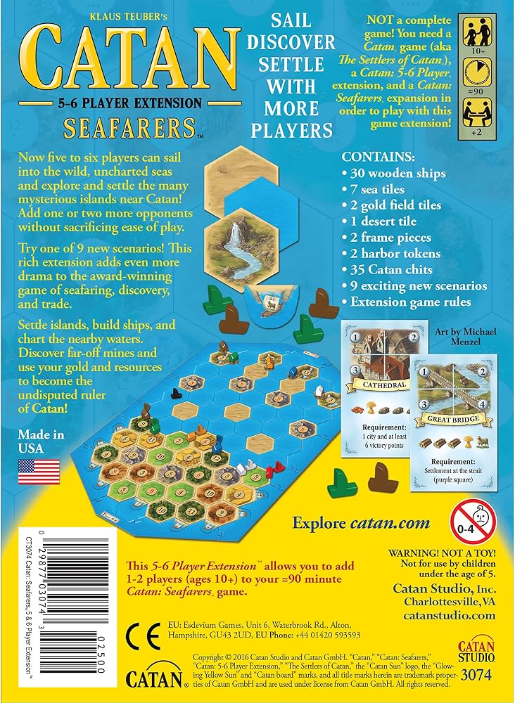 من أجل 3-4 لاعبين: تم تصميم هذا التوسيع من أجل 3-4 لاعبين ويتطلب لعبة Catan الأساسية للعب، وإضافة القوارب والجزر والعناصر الغامرة إلى تجربة Catan الخاصة بك.