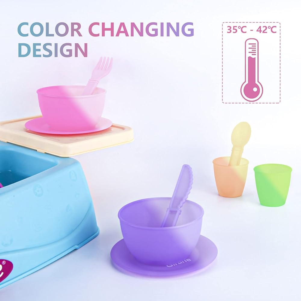 • تغيير الألوان السحرية والإكسسوارات اللطيفة: تأتي السكاكين والشوك والملاعق والأواني والأطباق بتصميم مبتكر حراري، وأنماط حيوانات لطيفة على الأطباق، مما سيجذب انتباه الأطفال. درجة حرارة الماء الموصى بها للعب تغيير اللون: 95 درجة فهرنهايت - 107 درجة فهرنهايت (35 درجة مئوية -42 درجة مئوية). سوف تتلاشى الأدوات عندما ترتفع إلى 35 درجة مئوية وما فوق، وتعود إلى لونها الأصلي عندما تكون باردة بدرجة كافية.