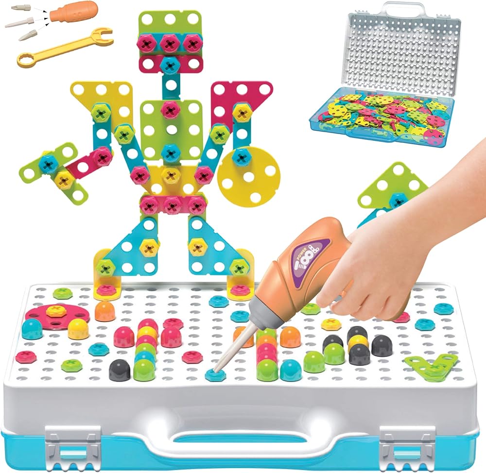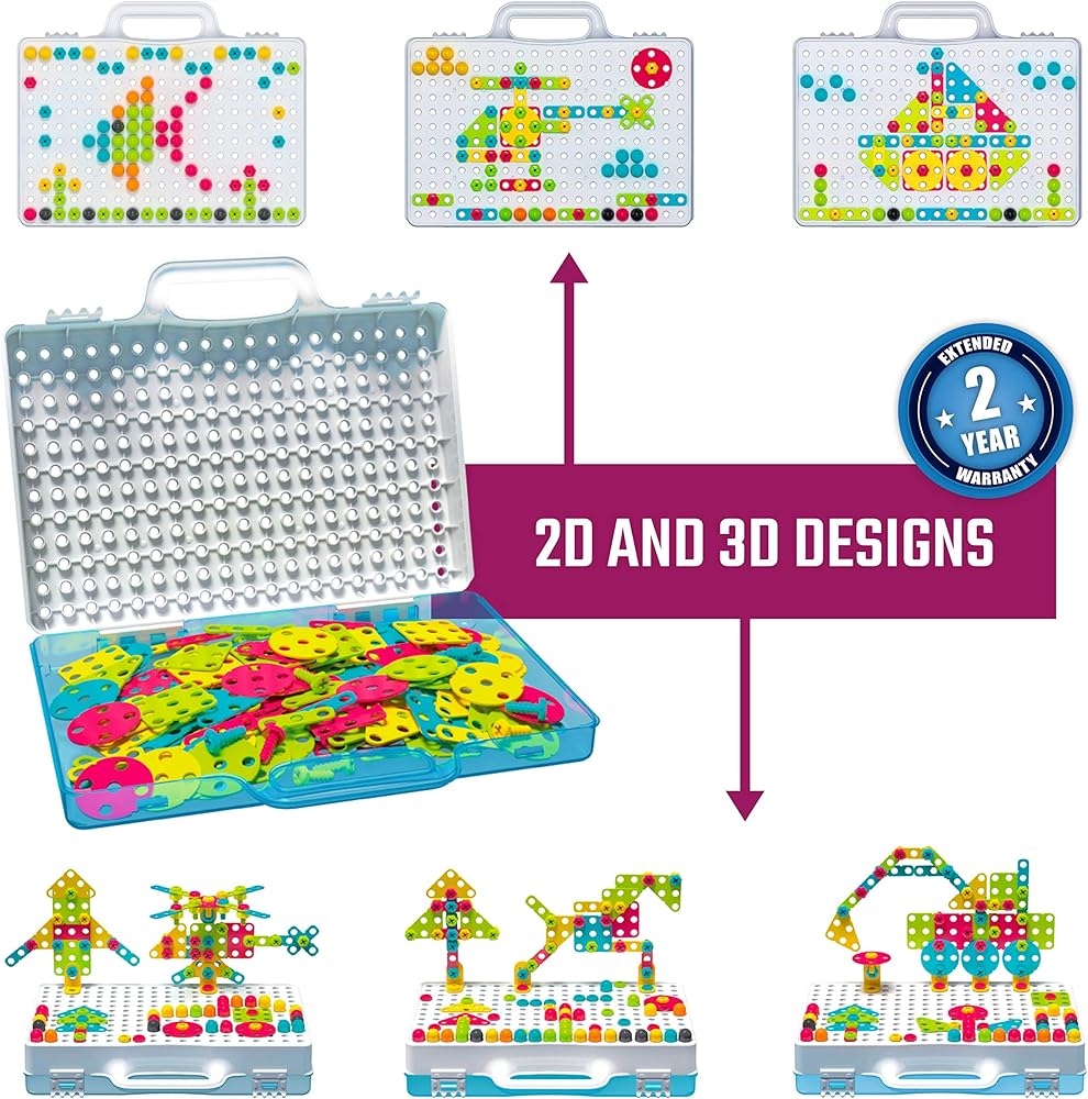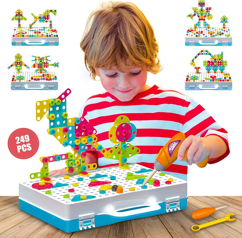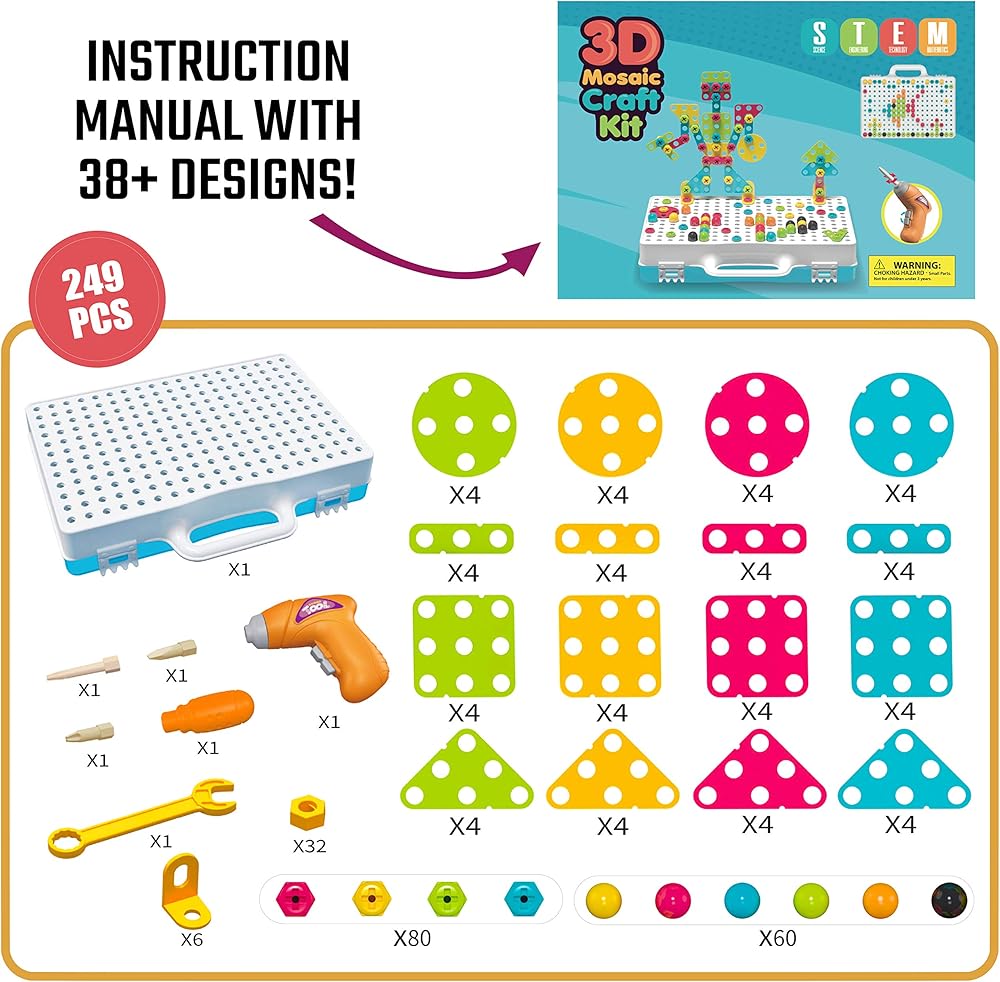 249 قطعة من الألعاب التعليمية الجذعية - مجموعة تعليمية للمثقاب الكهربائي، هندسة إبداعية بأشكال مختلفة و5 أدوات ألعاب - مجموعة بناء فسيفساء ثنائية وثلاثية الأبعاد للأطفال الصغار والأولاد والبنات من عمر 3 4 5 6 7 8 9