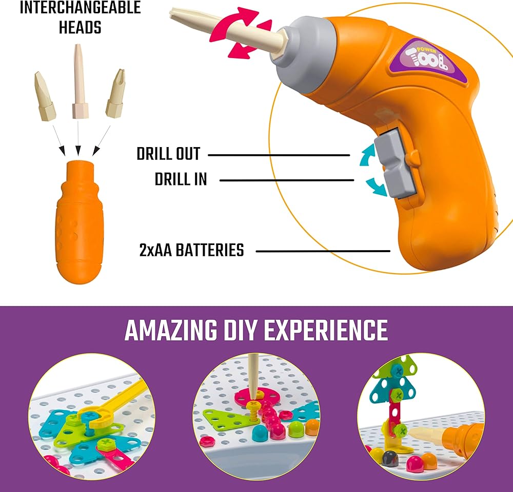 • EDUCATIONAL & FUN EXPERIENCE: Build unique models, or create your own designs! No other toy will give children the same building, drilling and learning experience. Use the electric drill (2 AA batteries not included), wrench or screwdriver to fasten each piece together. It is completely interactive, so whatever children build can be taken apart and built again with the included step by step instructions or on their own without any additional aids.