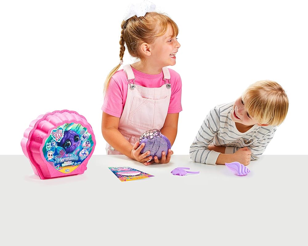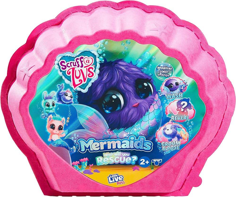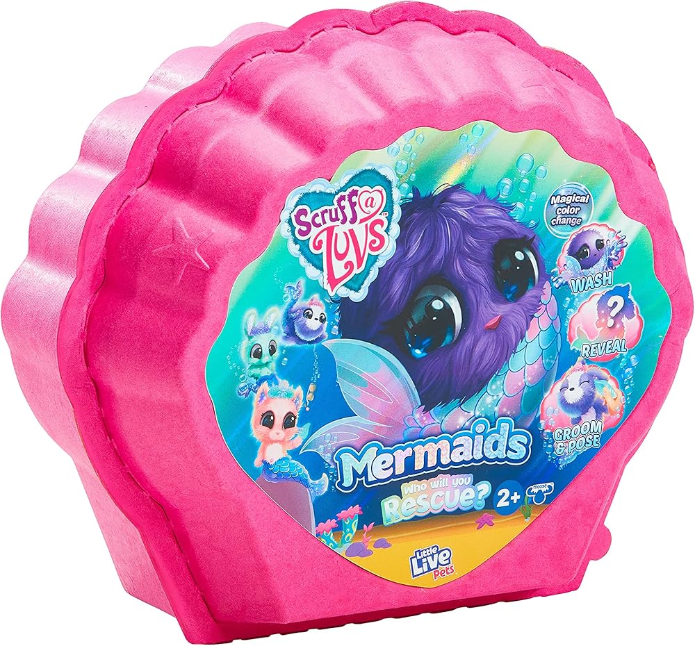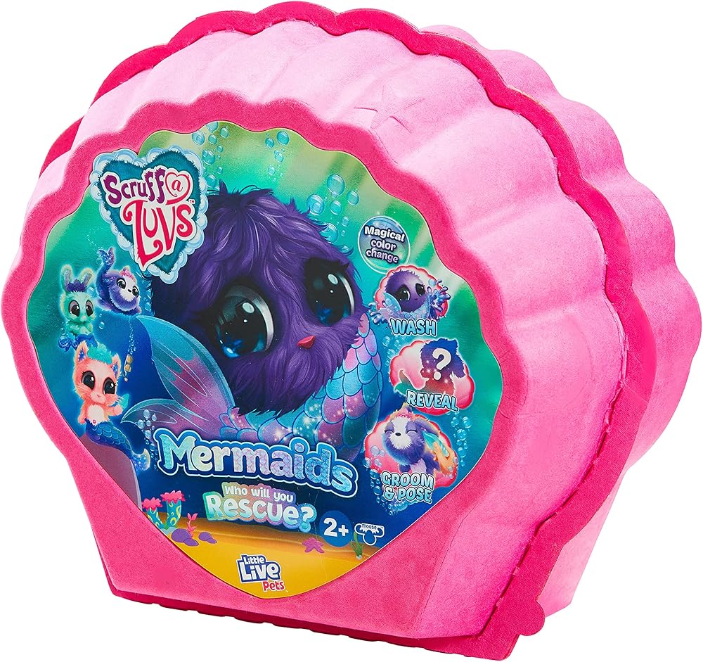 أكثر حوريات البحر روعة في انتظارك لإنقاذهم. تم التخلي عن حورية البحر سكراف-ايه-لوفز وأخذت مأوى داخل صدفة البطلينوس. إنهم بحاجة إلى مساعدتك لإنقاذهم والعناية بهم. يوجد داخل الصندوق حيوان أليف حورية البحر غامض ينتظر إنقاذه! من ستنقذ؟ هل لديك كلب حورية البحر أو قطة حورية البحر أو أرنب حورية البحر؟ يصل حيوانك الأليف على شكل حورية البحر ككرة حزينة من الفرو غير اللامع، ولكن بمجرد أن تستحمه سيتغير لونه بطريقة سحرية! بمجرد تجفيفها، قم بتمشيطها وحبها وستكتشف أي نوع من الحيوانات الأليفة هي حقًا! كل حورية البحر سكراف-ايه-لوف لها ذيل لامع جميل وجوهرة لعبة لامعة في زر البطن! استخدم الملحقات لجعلها تبدو رائعة. ضع تاجهم على رأسهم واستخدم مشطه الخاص على شكل صدفة لتصفيف حيوانك الأليف الجديد. ذيل حورية البحر الخاص بك قابل لاتخاذ الوضعيات أيضًا حتى تتمكن من وضعه بعد جلسة العناية به وجعلها تبدو مميزة للغاية! تأتي كل دمية حورية البحر سكراف-ايه-لوف مع شهادة تبني لك لملئها وجعلها خاصة بك! مع الحب والرعاية، ستكون هذه الحيوانات الأليفة السحرية تحت الماء هي صديقك المفروش للأبد!