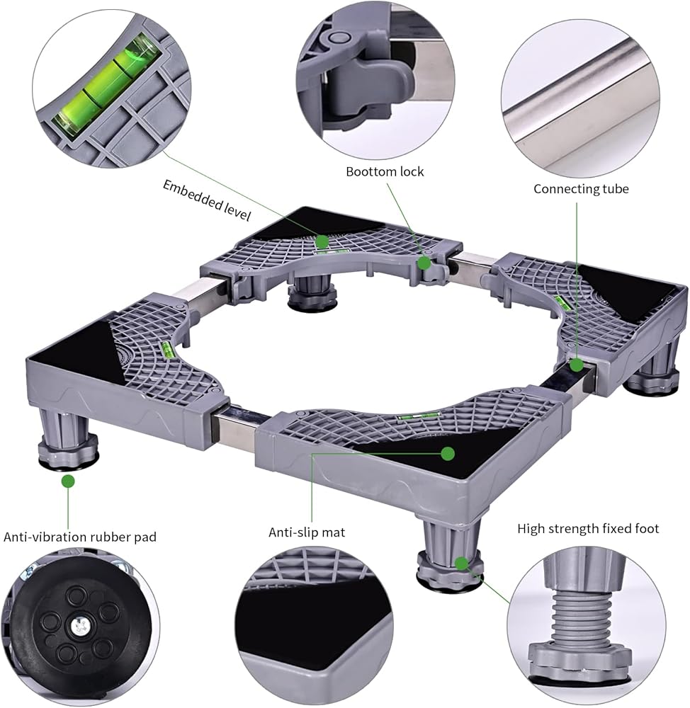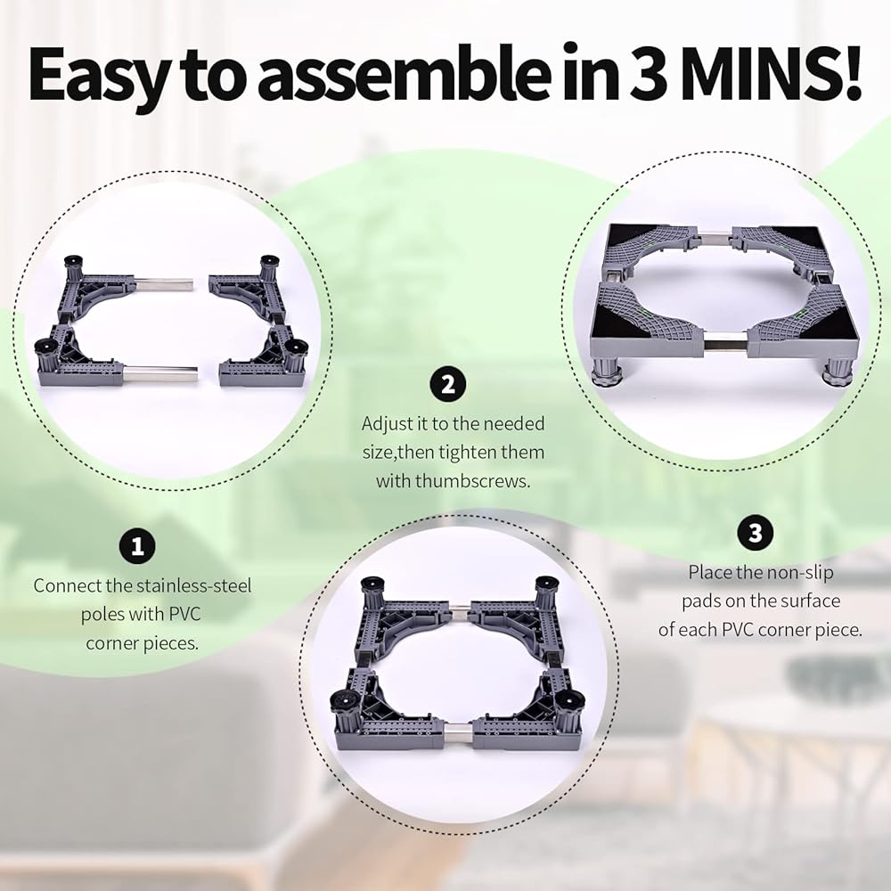 • 【سهل التركيب】يحتوي حامل قاعدة الغسالة على 4 أقدام قوية، و4 قطع من الوسائد المضادة للانزلاق، و4 أقطاب متينة من الفولاذ المقاوم للصدأ. سهل التجميع، ولا يتطلب أدوات
