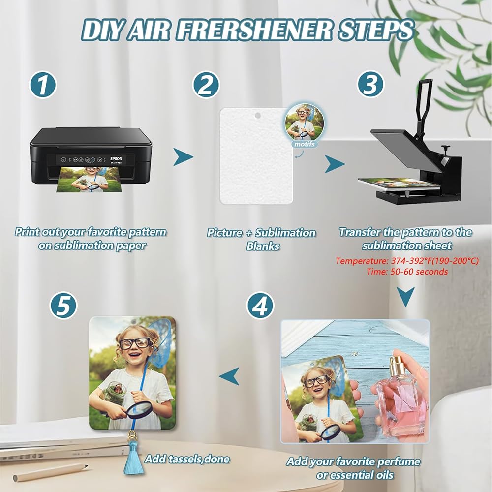 سهل الاستخدام: انقل النمط عند 190-200 درجة مئوية (374-392 درجة فهرنهايت) لمدة 50-60 ثانية. رش العطر أو الزيوت العطرية على أوراق معطر الهواء للحصول على نفس الهواء النقي في المنزل أو في السيارة. كل ورقة تحتوي على فتحة صغيرة يمكنك من خلالها تمرير السلك المرن على الورقة وربطه بسيارتك أو في أي مكان تريده في منزلك.
