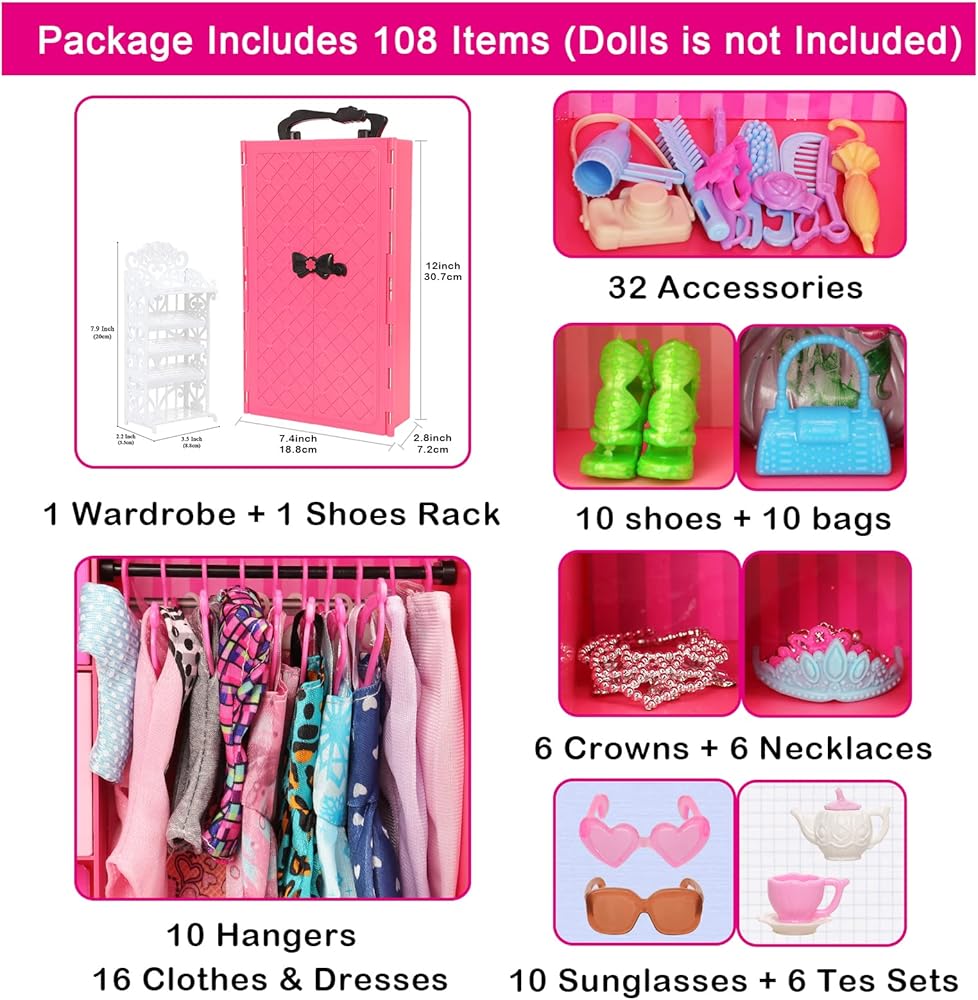 ما الذي يمكنك الحصول عليه 107 قطعة تتضمن خزانة ملابس واحدة ورف أحذية و16 عبوة من ملابس الدمى (2 فستان زفاف، 2 فستان عصري، 2 بلوزة 2 سروال، 2 ملابس سباحة، 8 فساتين صغيرة) و13 قطعة من إكسسوارات الدمى، 10 أكياس، 10 أحذية، 10 علاقات، 6 قلادات 6 تيجان، 10 نظارات، 6 إكسسوارات شاي، 17 إكسسوارات دمية 29 دمية 0.07 انش (لا تشمل الدمى، نمط عشوائي)