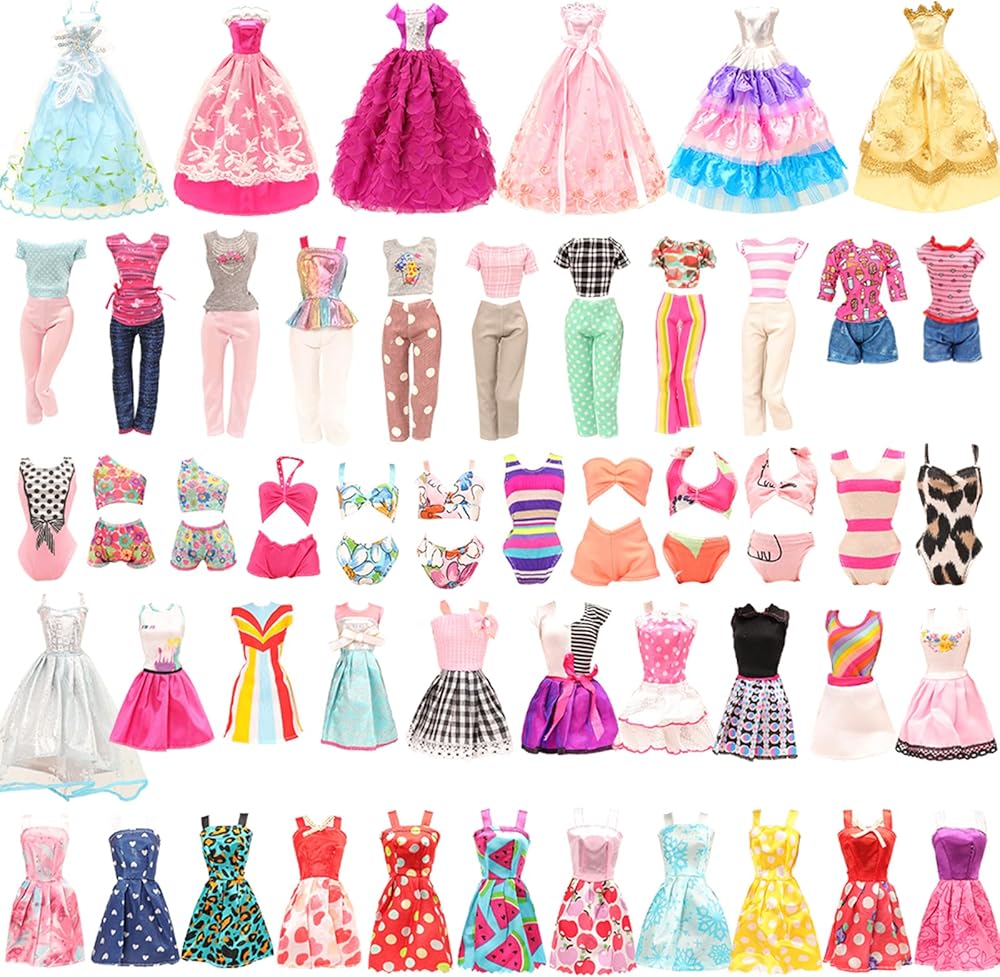 بروة مجموعة ملابس دمى عصرية مكونة من 42 قطعة لدمى مقاس 11.5 انش مع 5 قطع فساتين وملابس و37 قطعة مختلفة من شماعات الاحذية والقلائد واكسسوارات الدمى هدية الكريسماس