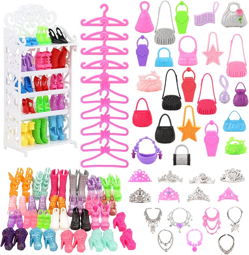 خزانة ملابس عصرية مكونة من 73 قطعة من اكسسوارات الدمى و16 عبوة من ملابس الدمى ورف أحذية و55 قطعة مختلفة من شماعات الأحذية والقلادة والتاج وإكسسوارات الدمى هدية الكريسماس