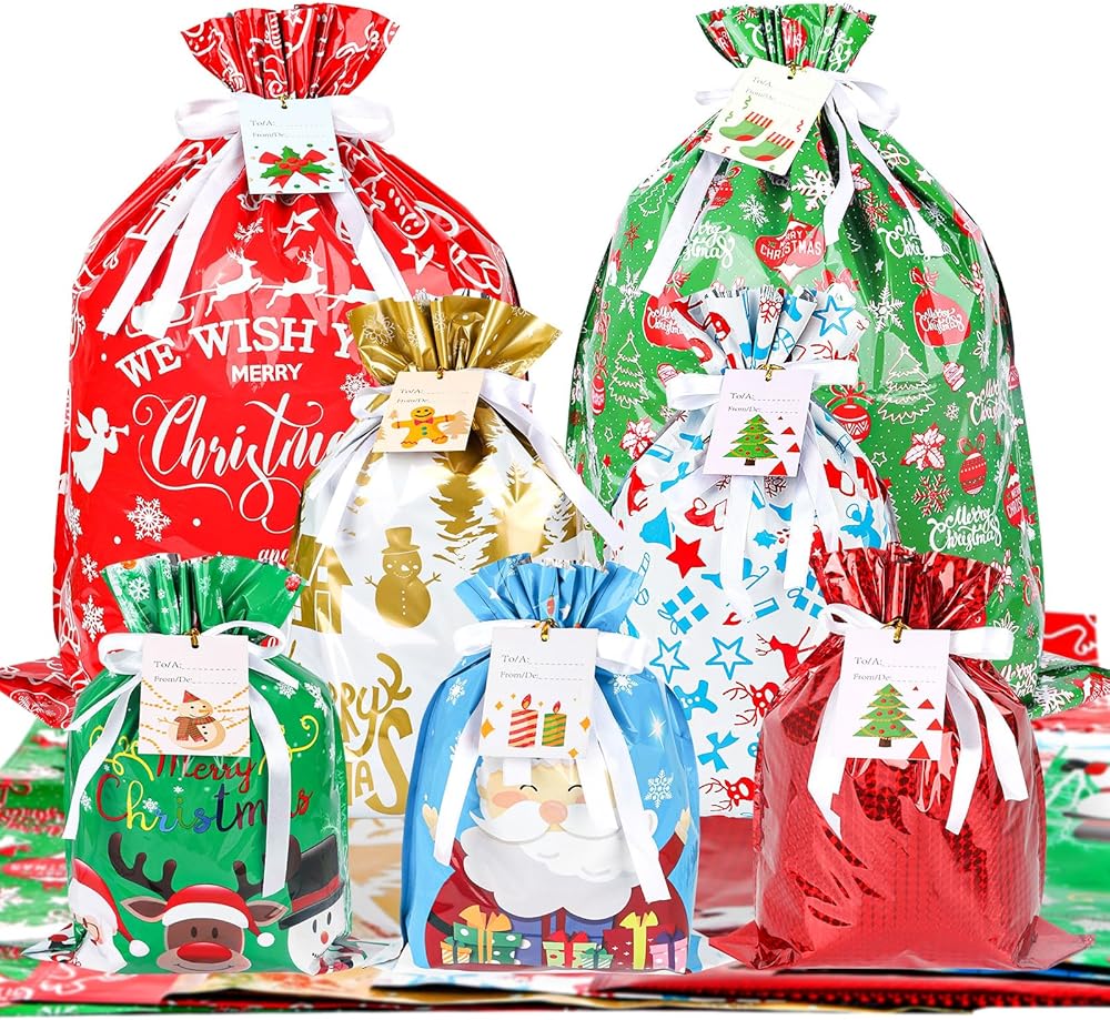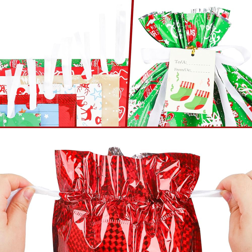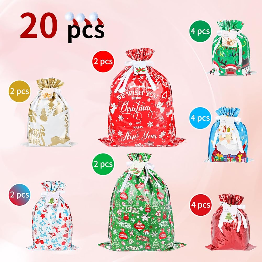 أكياس هدايا عيد الميلاد من كيشمنيو، أكياس هدايا برباط مع علامات شريطية لهدايا العطلات، 20 قطعة من أكياس تغليف هدايا عيد الميلاد من رقائق الكريسماس لهدايا عيد الميلاد (كبيرة متوسطة صغيرة)