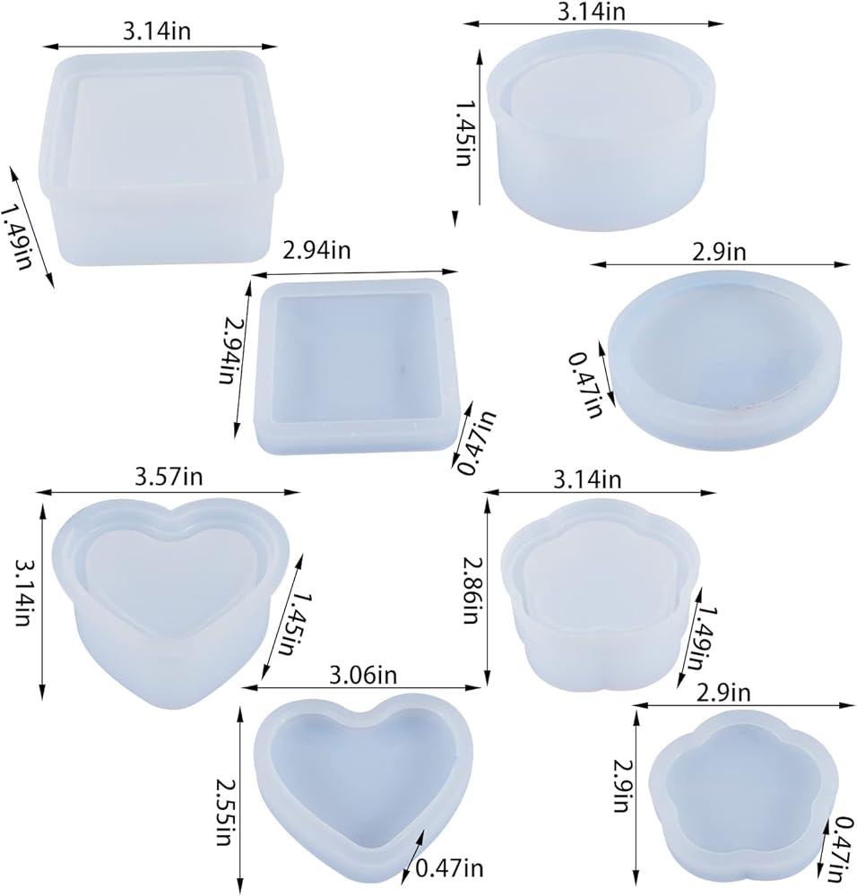 1. هناك 4 قطع من قوالب الراتنج لصندوق المجوهرات في العبوة (تشمل قطعة واحدة مستديرة الشكل، 1 قطعة شكل مربع، 1 قطعة على شكل قلب، 1 قطعة شكل زهرة)، الحجم كما هو موضح في الصورة.
