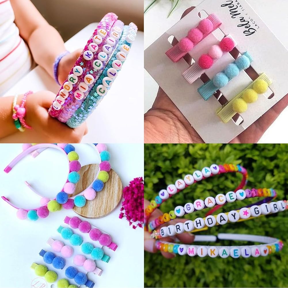 • 【424PCS DIY Hair Accessories Material Kit】 - Including three cute gradient hair bands, 10 solid color twisted stick thin hair bands and 10 one word hair clips; 6 different colors of flower beads (27pcs in total) 104pcs random letter beads; 218pcs different colors of different shapes of heart shaped beads; 50 different colors of hairballs and 2pcs glue. Rich materials give children rich imagination.
