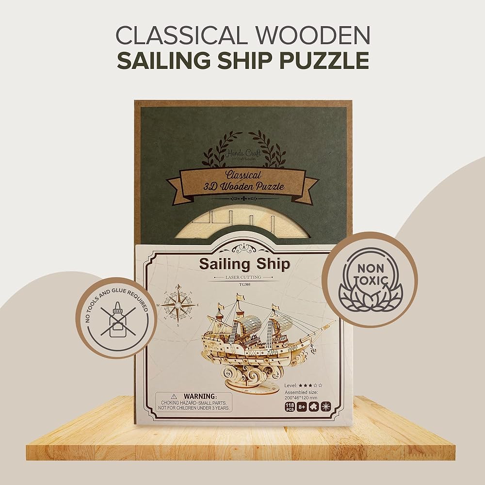 هاندز كرافت DIY لغز خشبي ثلاثي الأبعاد - سفينة شراعية مقطوعة بالليزر مجموعة بناء نموذج ألغاز تحفيز الدماغ لعبة تعليمية الجذعية للبالغين والمراهقين لبناء خشب ممتاز آمن وغير سام TG305A