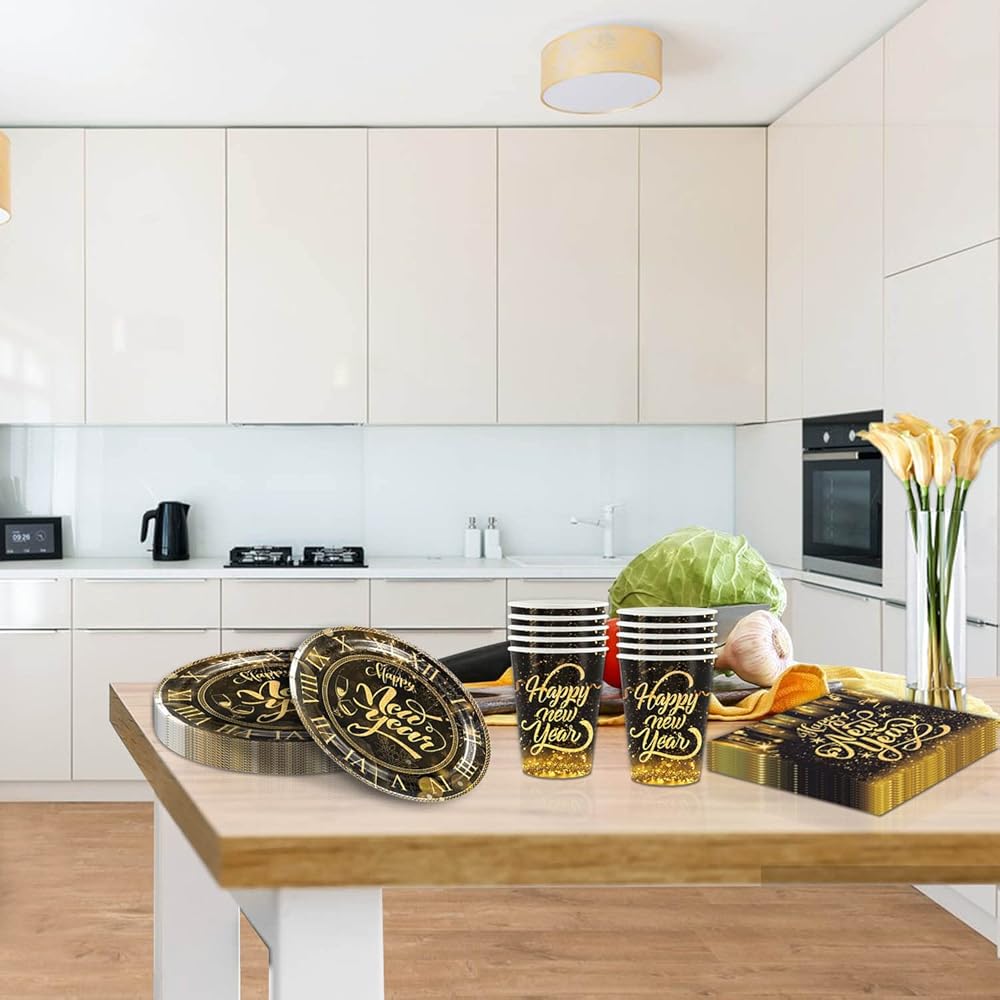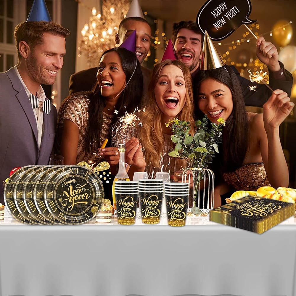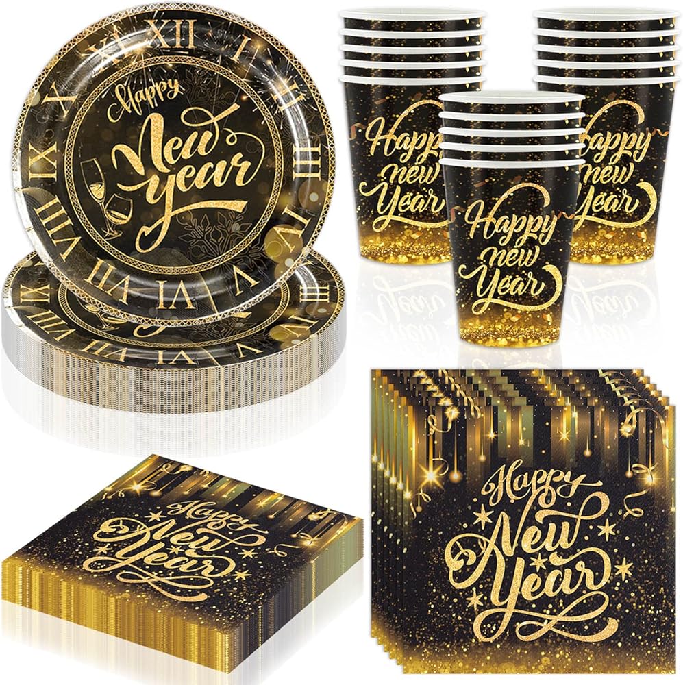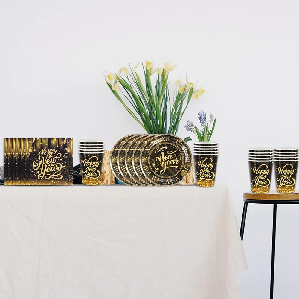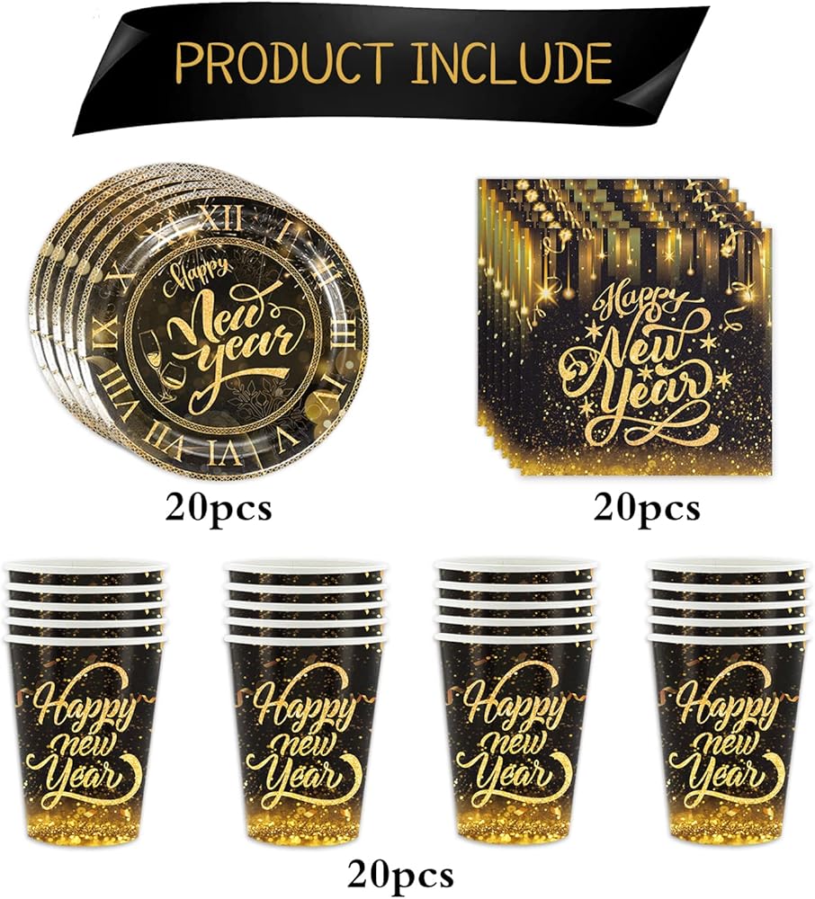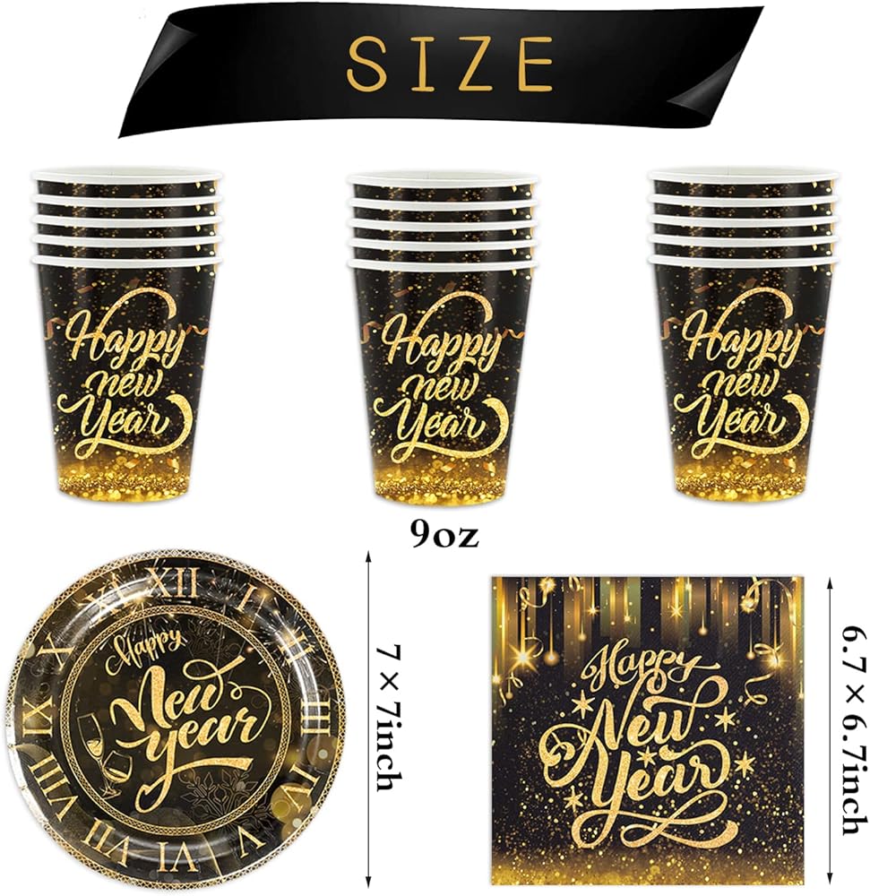 لوازم حفلات ليلة رأس السنة الجديدة 2023، ادوات مائدة للاستعمال مرة واحدة تتضمن اكواب واطباق ومناديل لتزيين حفلات ليلة رأس السنة الجديدة