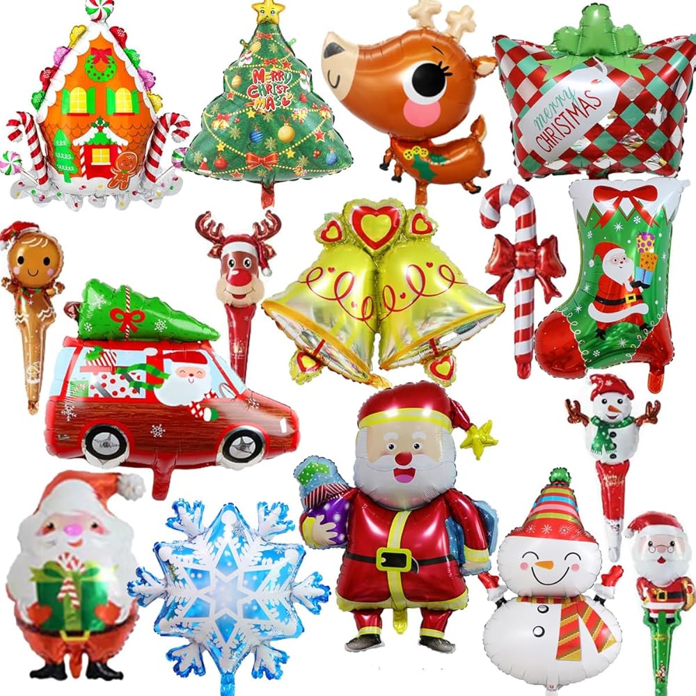 مجموعة بالونات عيد الميلاد القيمة - 16 بالونة من رقائق الألومنيوم بأنماط مختلفة، سانتا كلوز/رجل الثلج/الرنة/أجراس/هدايا/رقاقات الثلج/بيوت الحلوى/أشجار عيد الميلاد/عربات المحطة إلخ