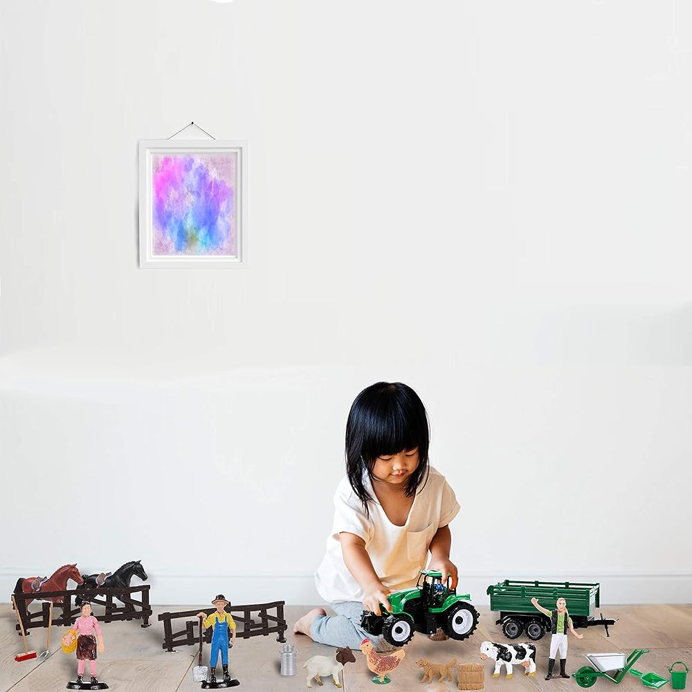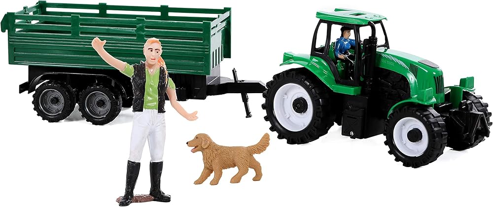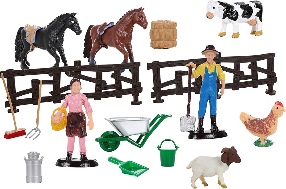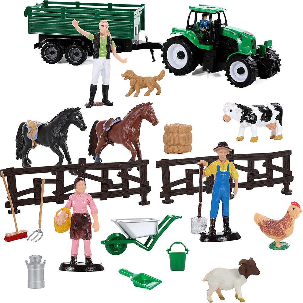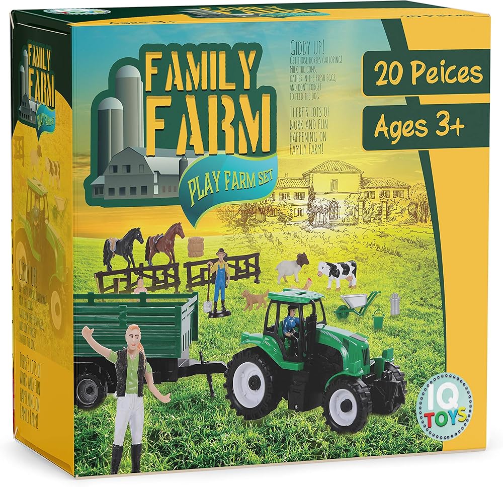 • تأتي مجموعة ألعاب المزرعة مع جرار وعربة وحصانين وبقرة وخروف ودجاجة وكلب و3 شخصيات عائلة مزرعة ومكنسة ومجرفة وعربة يدوية وإبريق حليب ومجرفة وقش وسياج