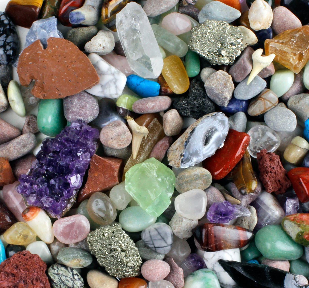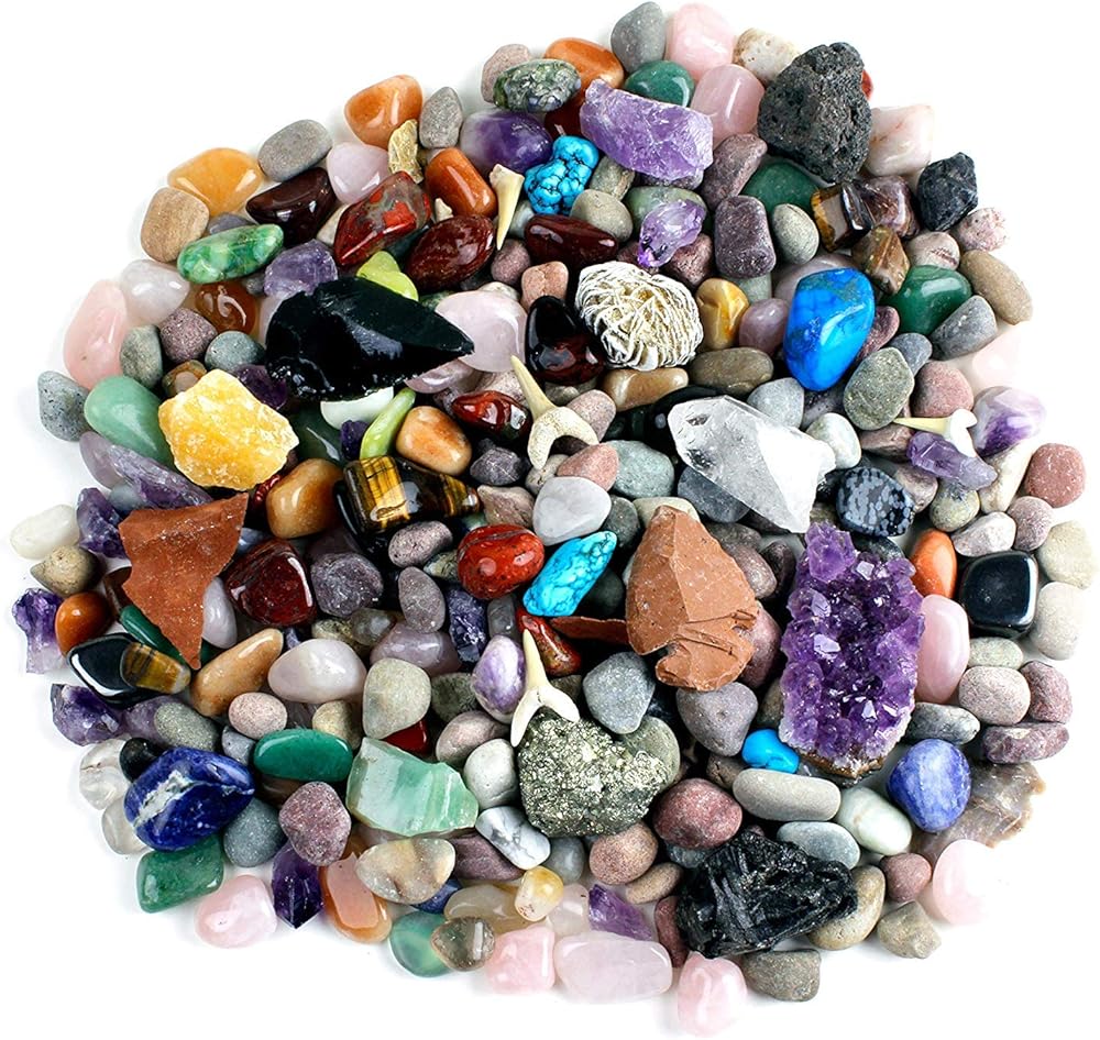 <b>ROCK, GEM & MINERAL COLLECTION ACTIVITY KIT: </b>over 150 pcs with <b>full-color educational identification sheet</b>. Favorites include: amethyst, quartz, tiger eye, jasper, calcite, turquenite and many others.