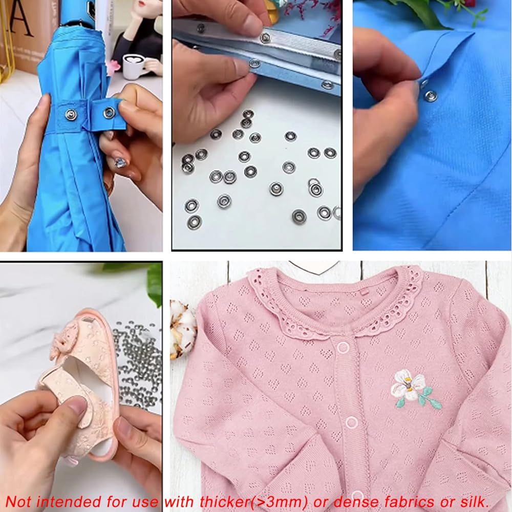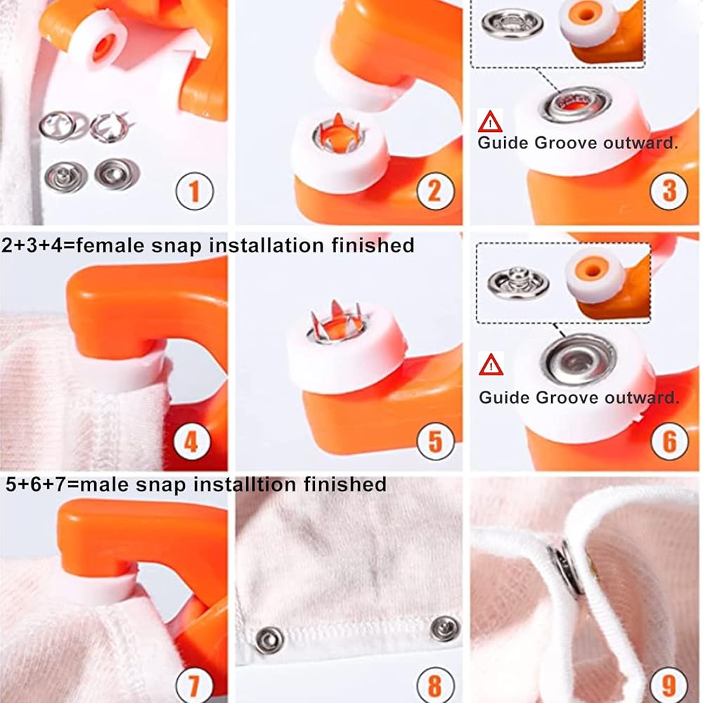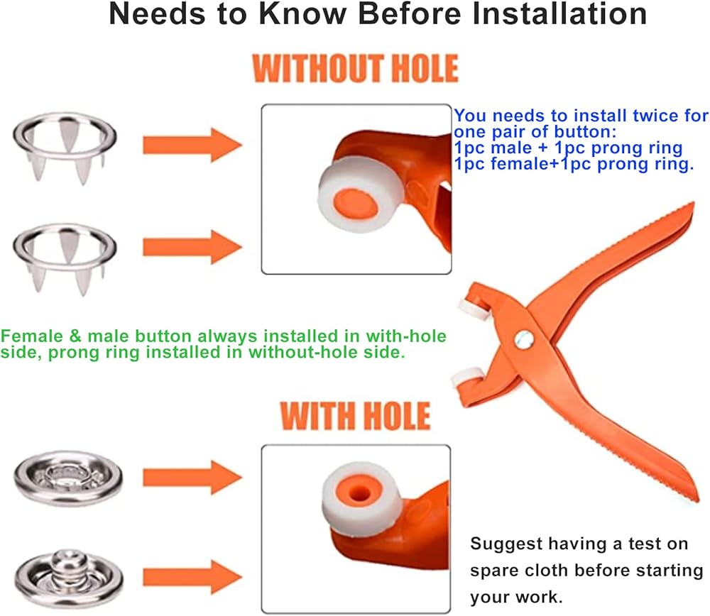 • راجع صورنا للحصول على أطراف التركيب. نقترح إجراء اختبار على قطعة قماش احتياطية قبل بدء عملك. لا حاجة لاستخدام مطرقة أو ثقب، لن يسقط القفل لأن حلقة الشق يمكن أن تجعل الكبس ثابتًا. استمتع بوقتك بنفسك.