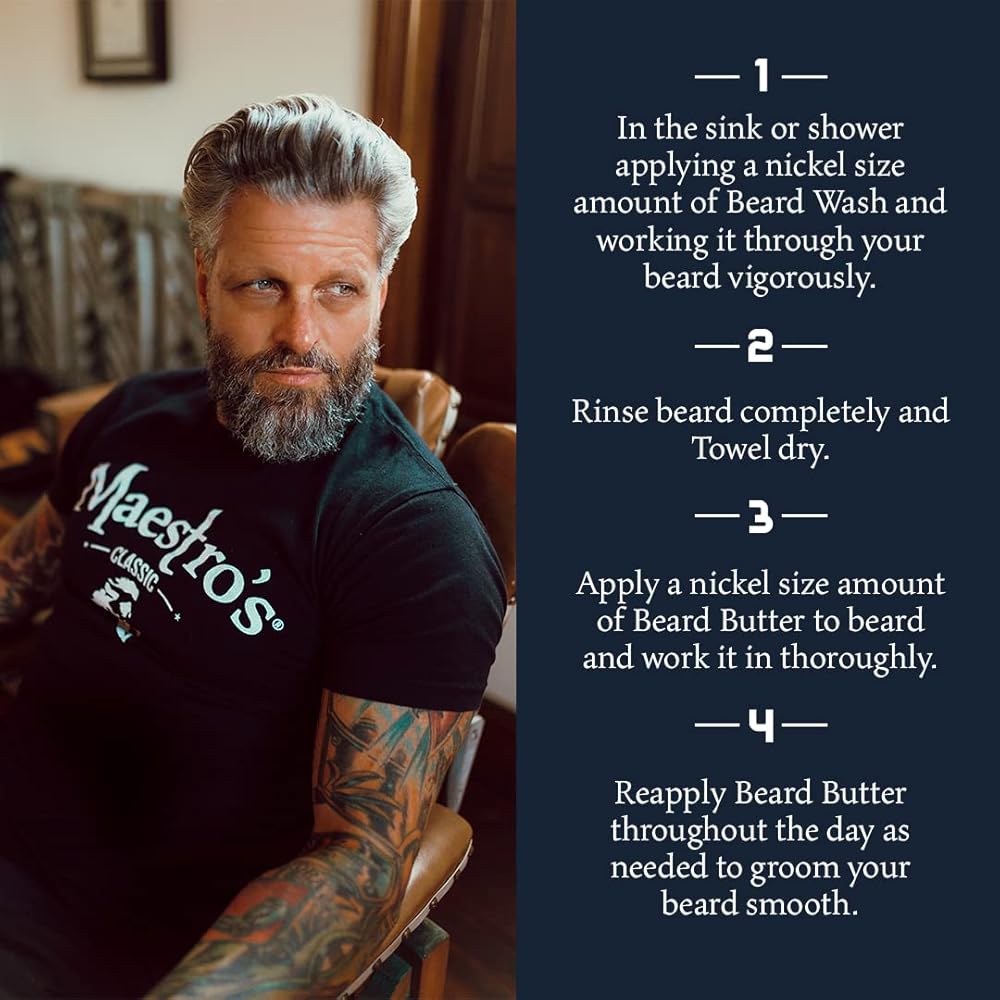 Maestro's Classic Beard Wash is designed with gentle, sulfate-free surfactants that aren't drying and are filled with multiple beard and skin conditioning agents. A foaming action was added to upgrade its performance and bring you back to a time when cleaning was fun. This specially prepared formula will be the difference in cleansing and conditioning your beard. It's the first step in Crafting a Better You with beard care products. Maestro's Classic Beard Butter will put an end to itchy, unruly facial hair. While other products may leave your beard and skin feeling greasy, our classic beard butter's water-soluble formula adds moisture without an oily residue. Our original product includes multiple conditioning agents that give you a more manageable and less itchy beard. It's the Second step in Crafting a Better You with beard care products.