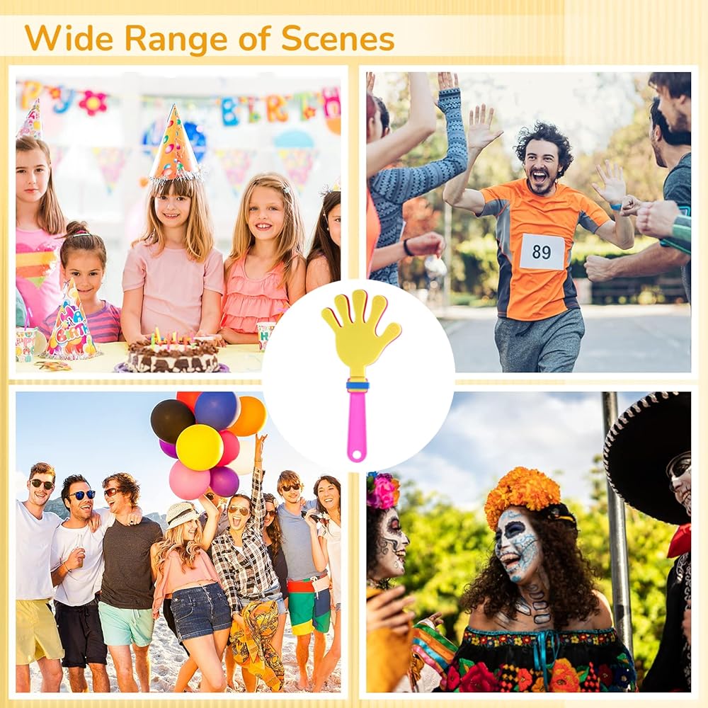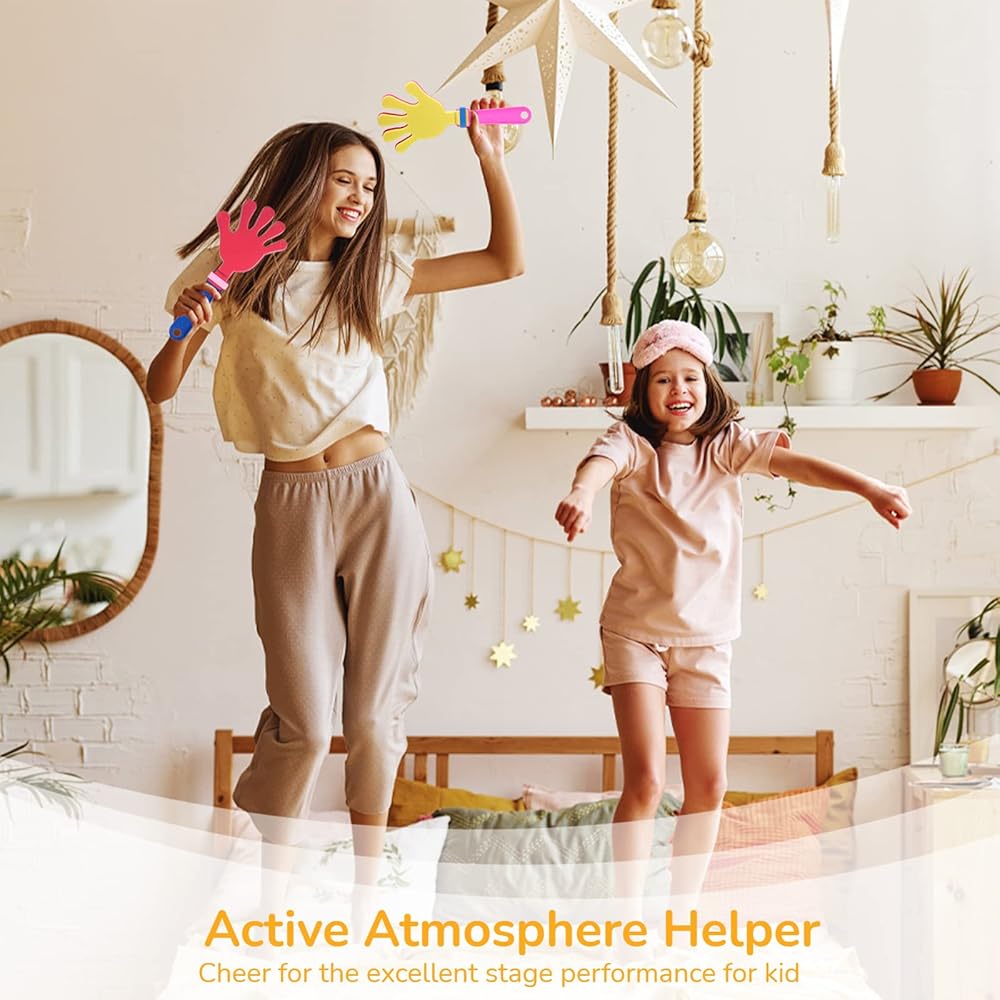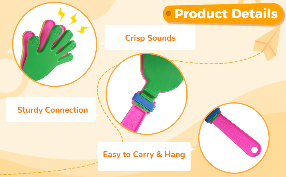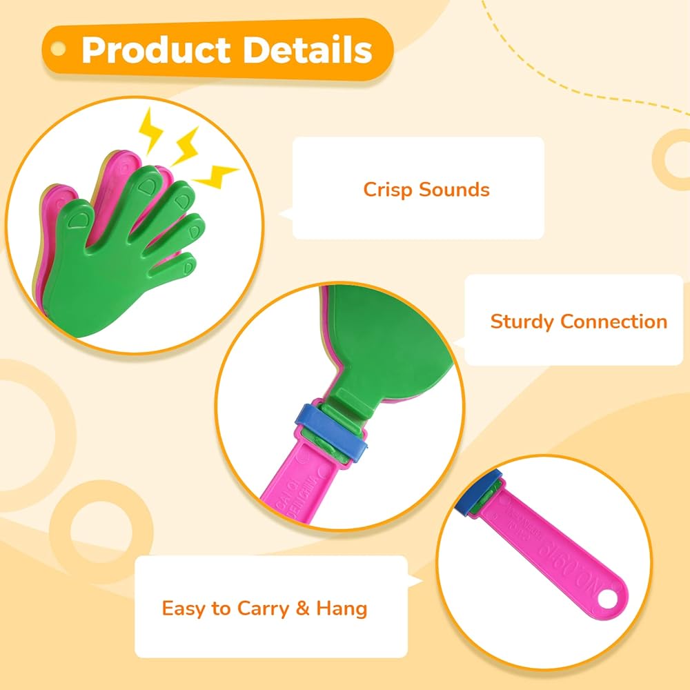 【بلاستيك قوي وموثوق】 مشابك اليد الرقيقة هذه مصنوعة من البلاستيك السميك الانتقائي من أجل المتانة، وليس من السهل كسرها أو تشويهها. يمكنها إصدار أصوات عالية ونقية عند هزها، وهي مناسبة لإشعال الأجواء في مختلف الحفلات والاجتماعات. يمكنك استخدامها براحة وثقة.