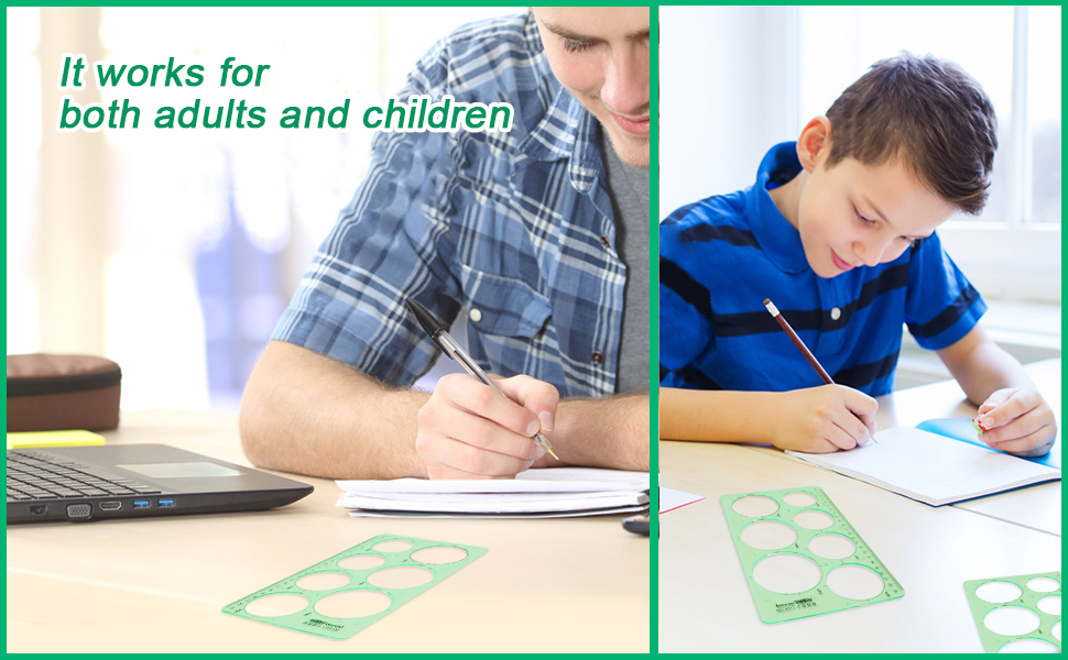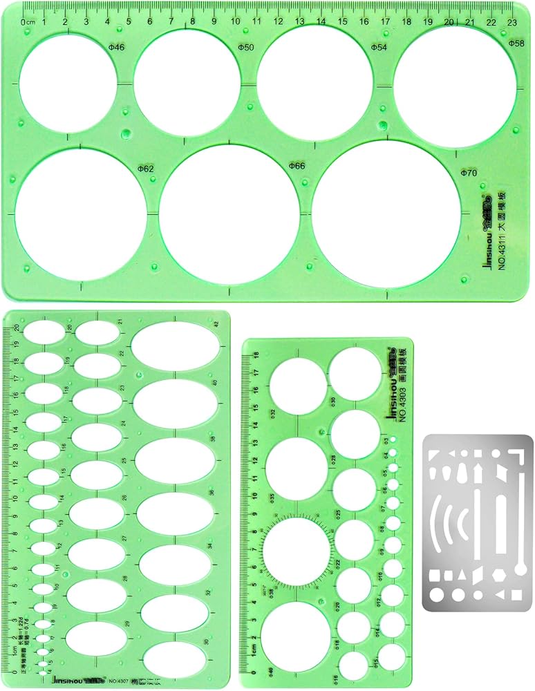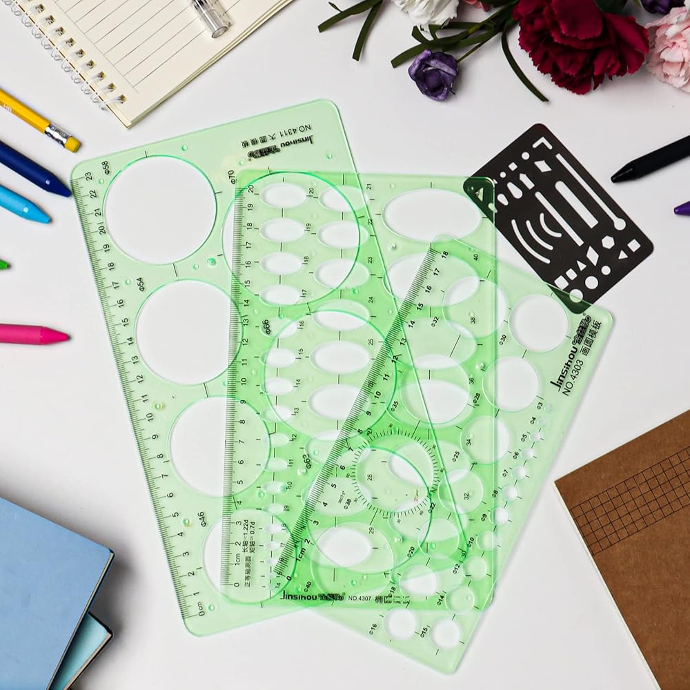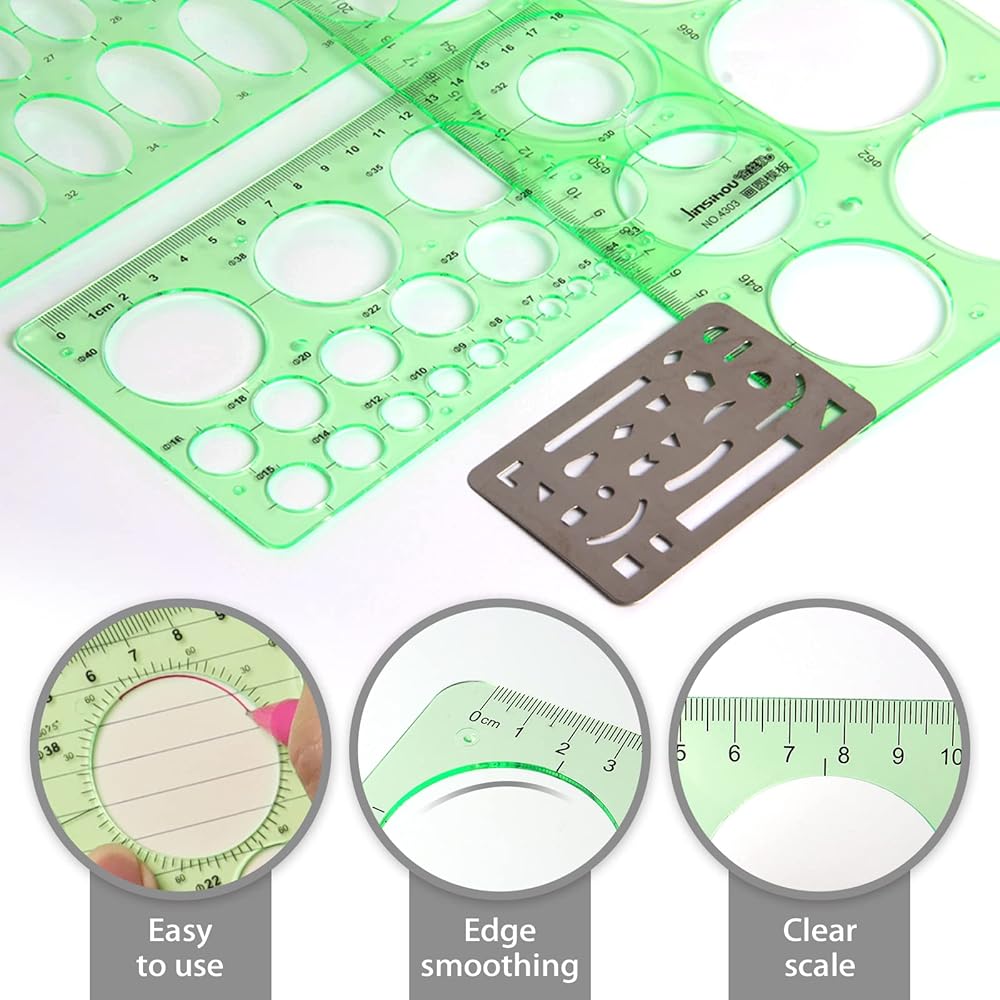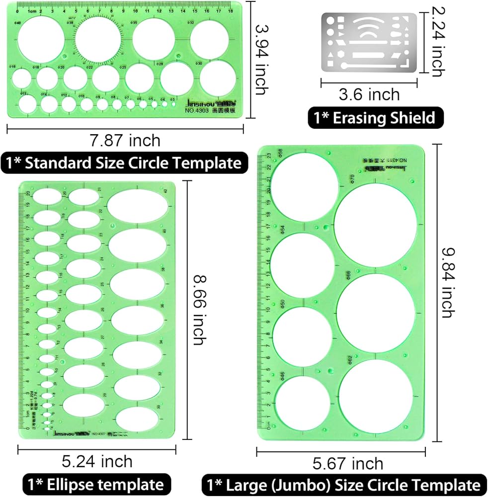 الخامة - قوالب رسم دائرية مصنوعة من البلاستيك عالي الجودة ودرع محو مصنوع من المعدن، خفيفة الوزن ومتينة، ليس من السهل الانحناء أو التقسيم. سطح أملس يمنحك لمسة لطيفة ولون أخضر شفاف يحمي عينيك.