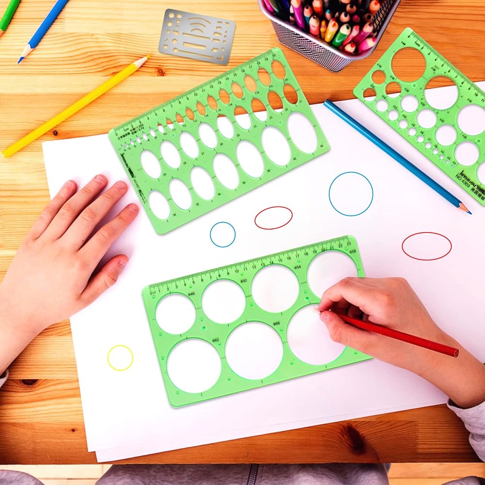 سهلة الاستخدام - تأتي قوالب الرسم الخاصة بنا مع قوالب رسومات هندسية دائرية وبيضاوية ودرع محو، قوالب ذات حجم مثالي بدلاً من قالب واحد كبير بجميع المقاسات مما يجعلها سهلة الوضع في عملك ويسهل حملها معك.
