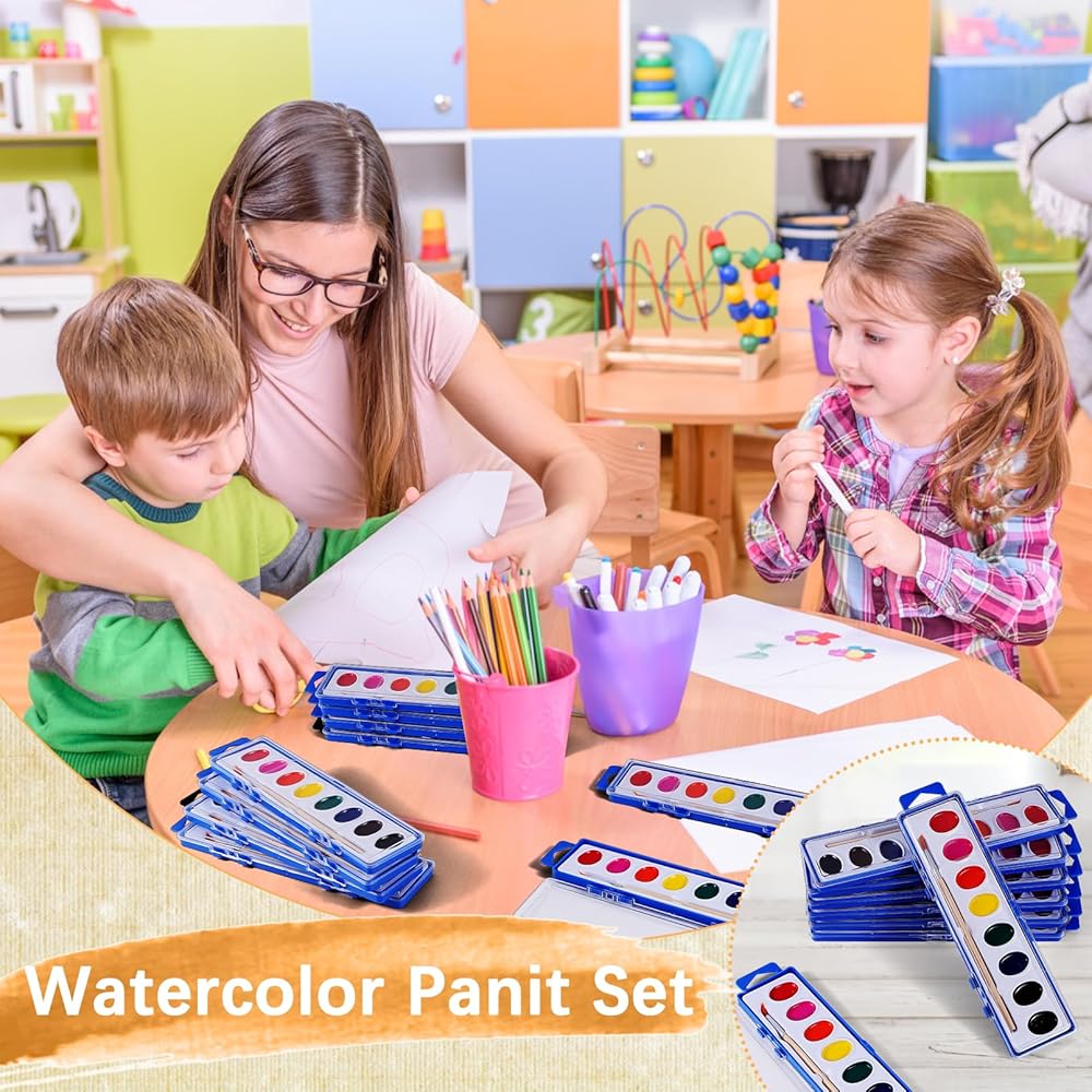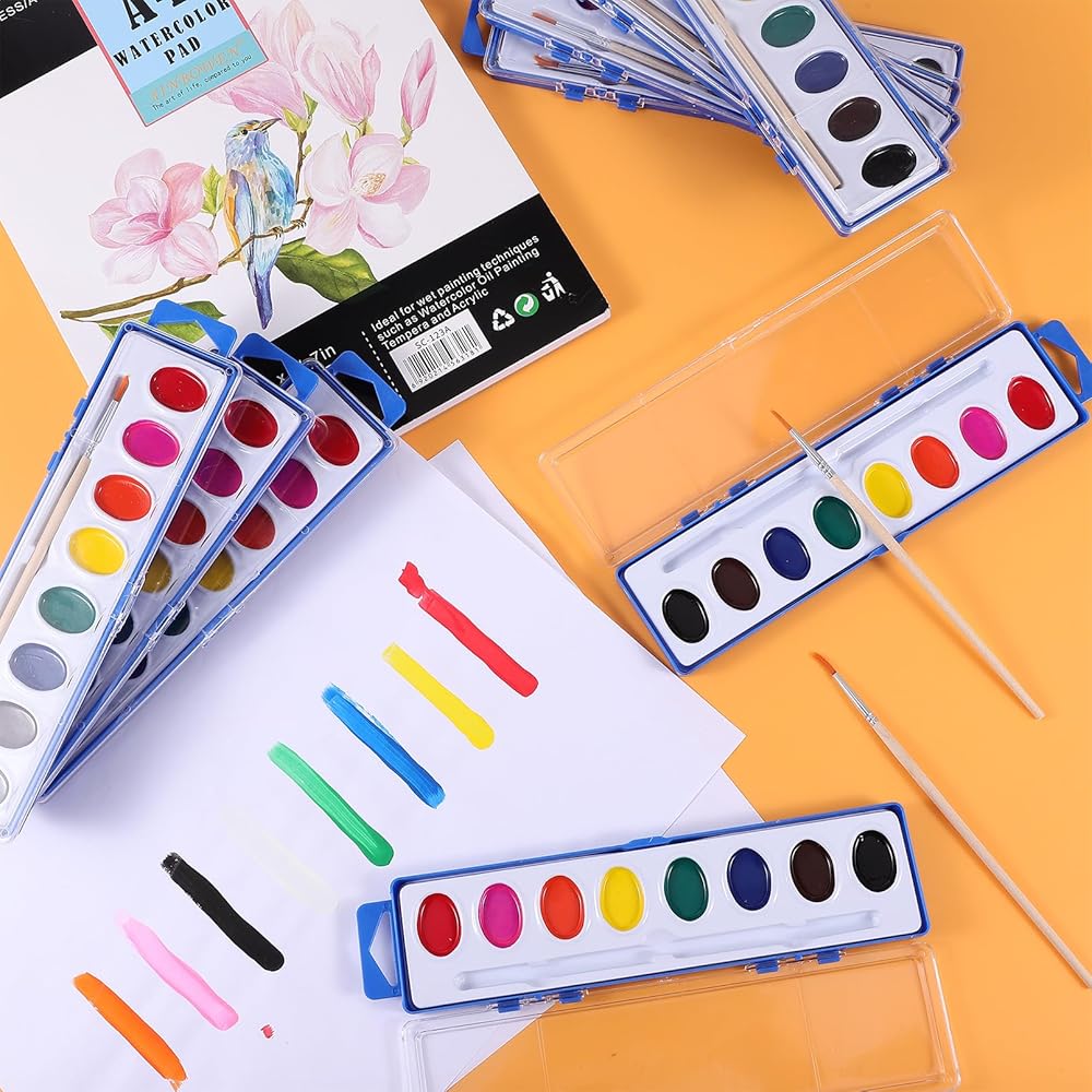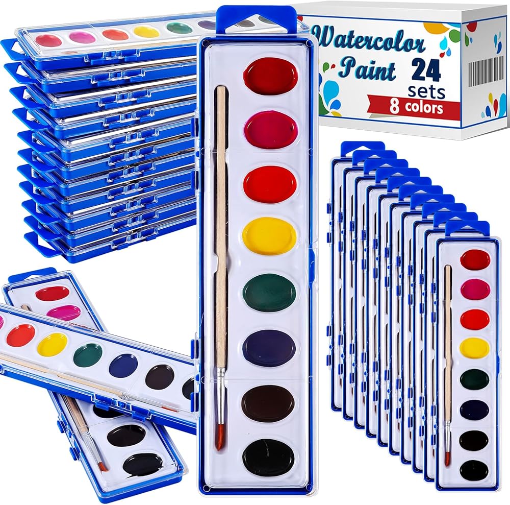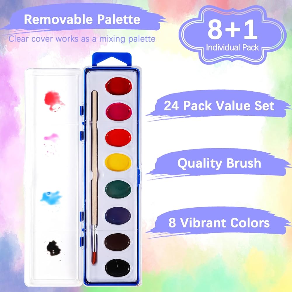 Bulk Paint Sets: 24 Pack of high-quality watercolor paint set, each individually wrapped, contains 8 vibrant colors and 1 wood paint brush. A great craft and craft set for everyone. Great watercolor sets for all ages.