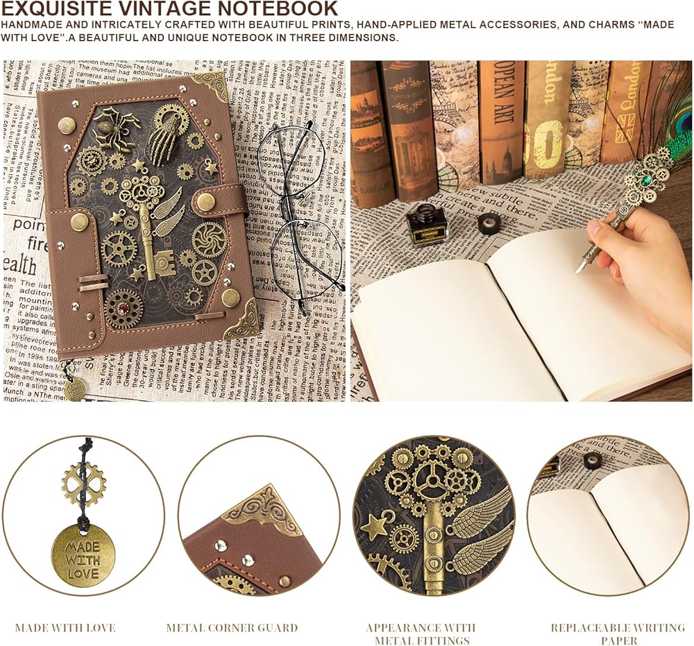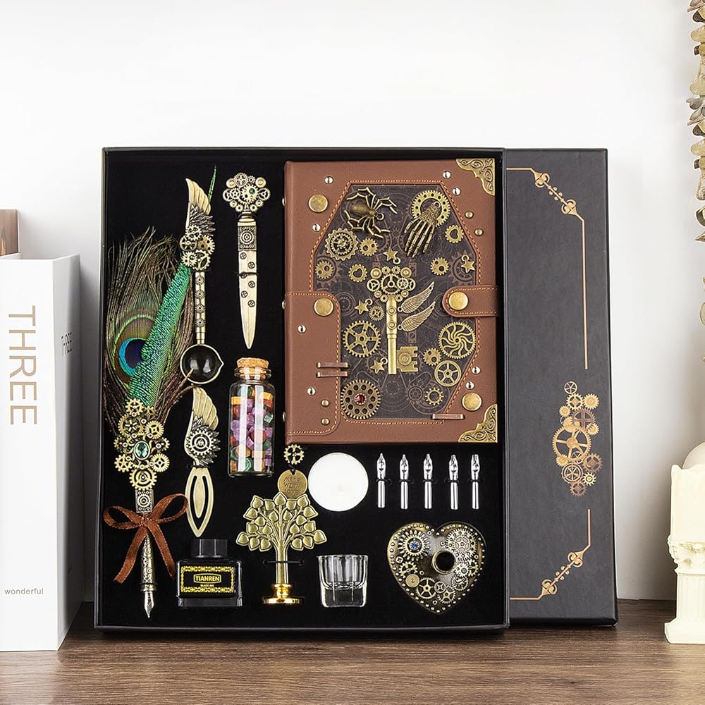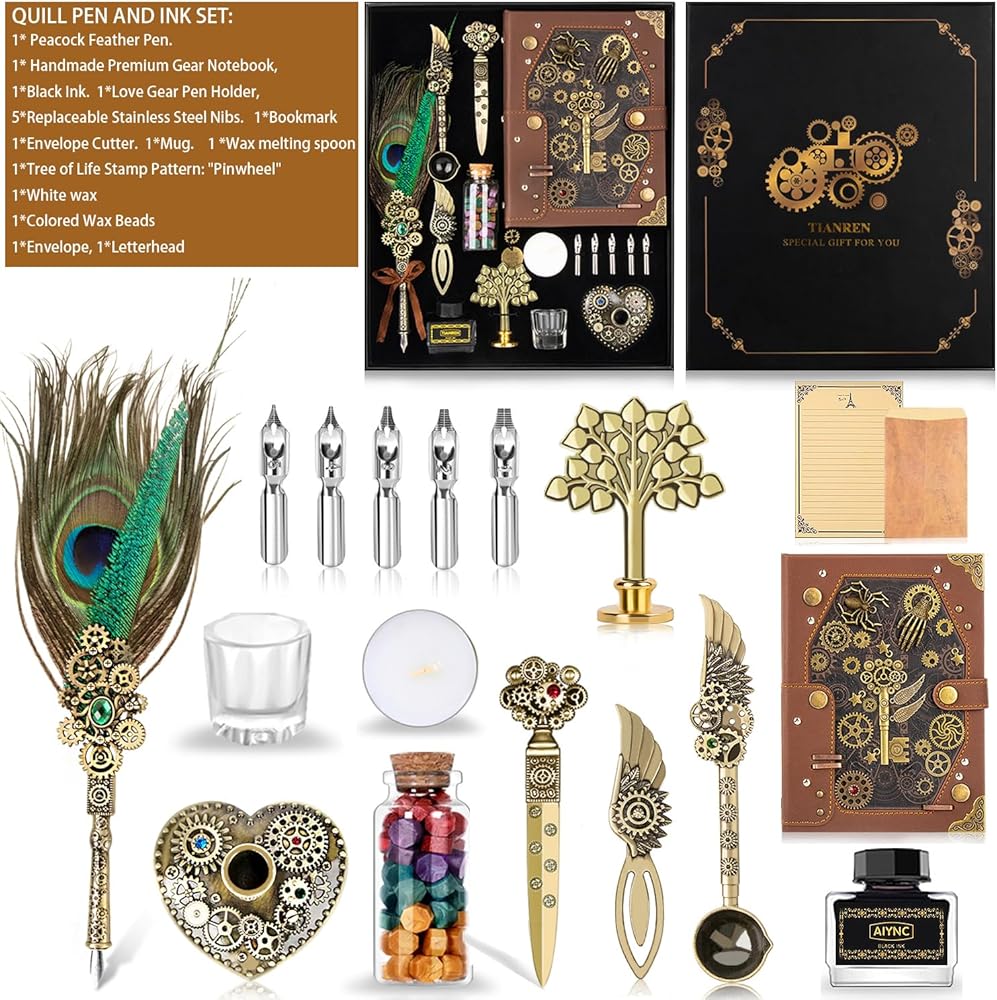 • 【QUILL PEN INK SET INCLUDED】: QUILL PEN AND INK SET:1* Peacock Feather Pen,1* Gear Notebook, 1*Ink (Black), 1*Love Gear Pen Holder, 5*Replaceable Stainless Steel Nibs,1*Tree of Life Stamp: Pattern"Pinwheel", 1*Bookmark, 1*Mug, 1*Melting Wax Spoon, 1*White wax, 1*Colored Wax Beads, 1*Envelope, 1*Letterhead, 1*Open Envelope Tool, 1 Exquisite Retro High-End Map Gift Box.