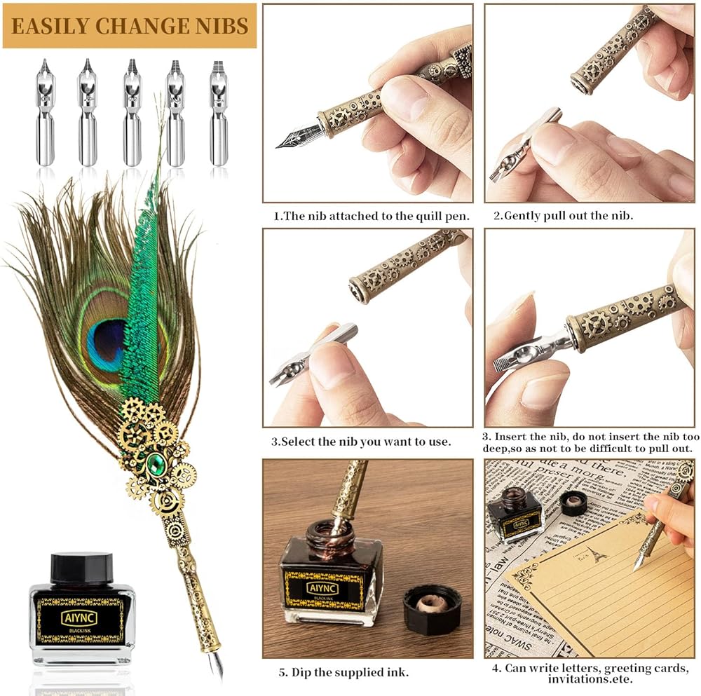 مجموعة حبر قلم الريشة من AIYNC، مع مجموعة ختم ختم الشمع للكمبيوتر الدفتري، مجموعة الخط الريش، هدايا عيد الحب لكتابة هدايا عيد الميلاد لمحبي الكتابة، هدايا الخط المثالية للعطلات (ريش الطاووس)