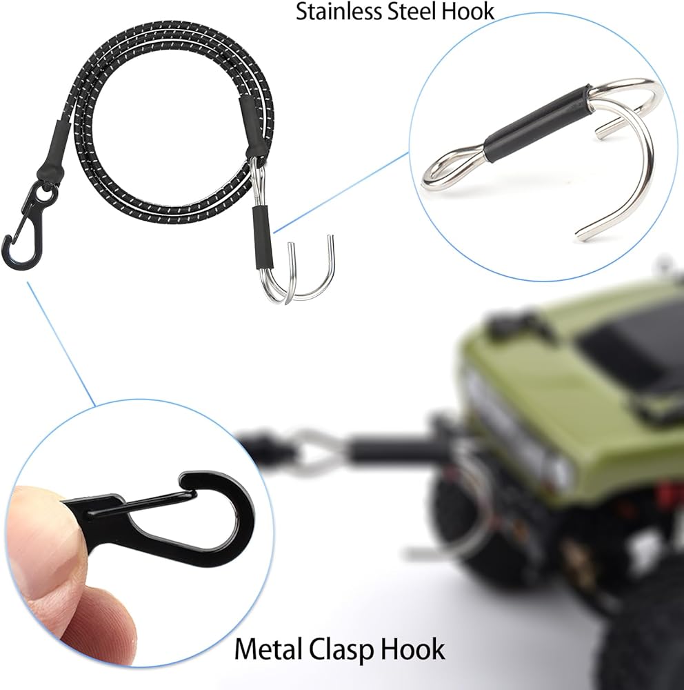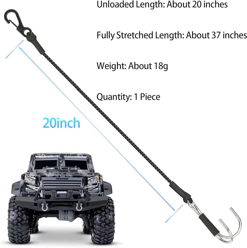 🍢[سهل الاستخدام] يبلغ وزن هذا الحزام 1/10 16 جم/القطعة، عند حوالي 20 بوصة (بدون تحميل) وحوالي 36 بوصة (تمدد كامل)، مما لن يضيف الكثير من الوزن للشاحنة. لقد استخدمنا حبالًا مرنة سميكة، ومن الواضح أن قوة الشد والصلابة أفضل. إنه مثالي لزاحف RC 1/10 الخاص بك.