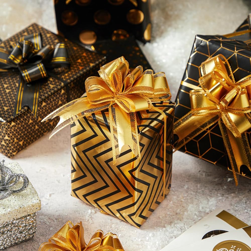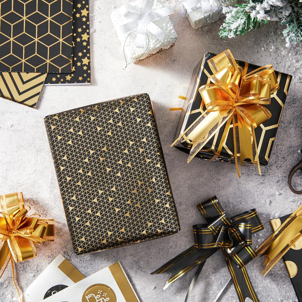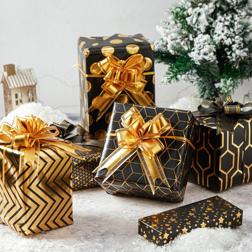 Elegant Holiday Packaging: Offer premium black and gold Christmas gift wrapping paper and bows that add a touch of sophistication and luxury to holiday gifts.