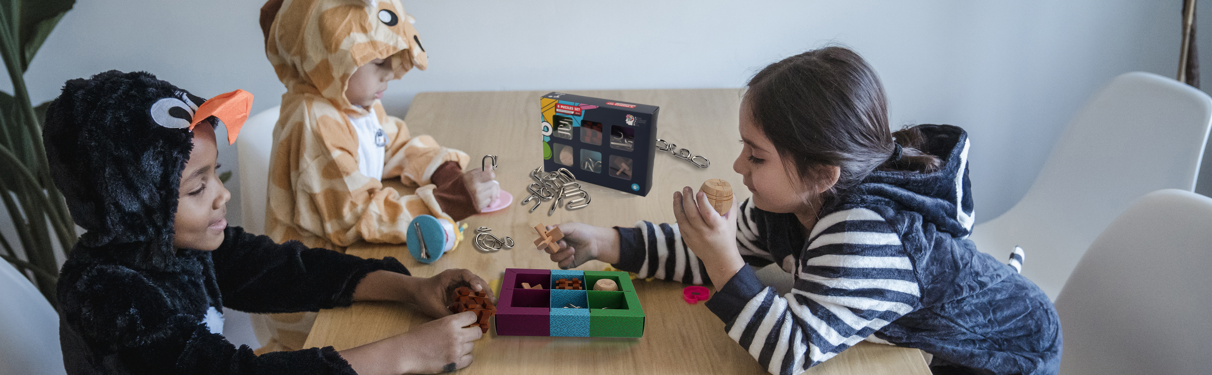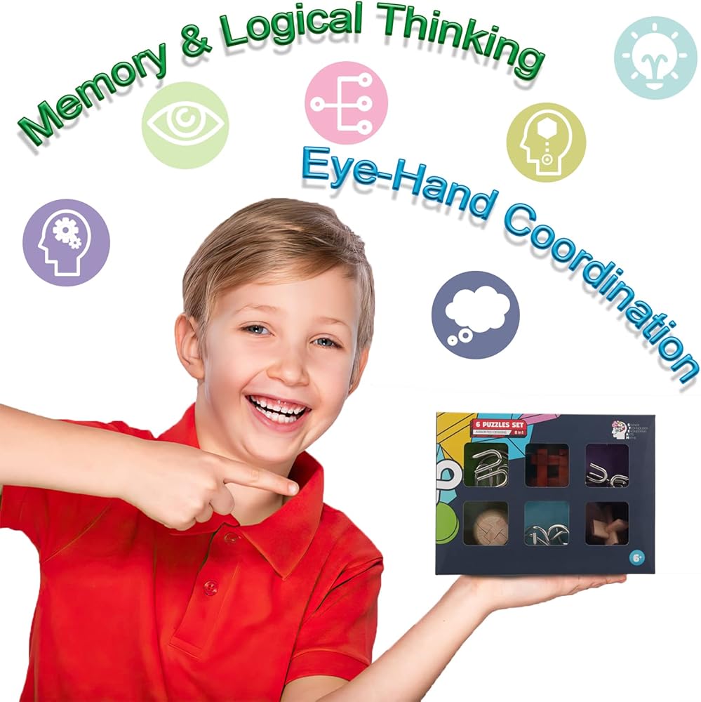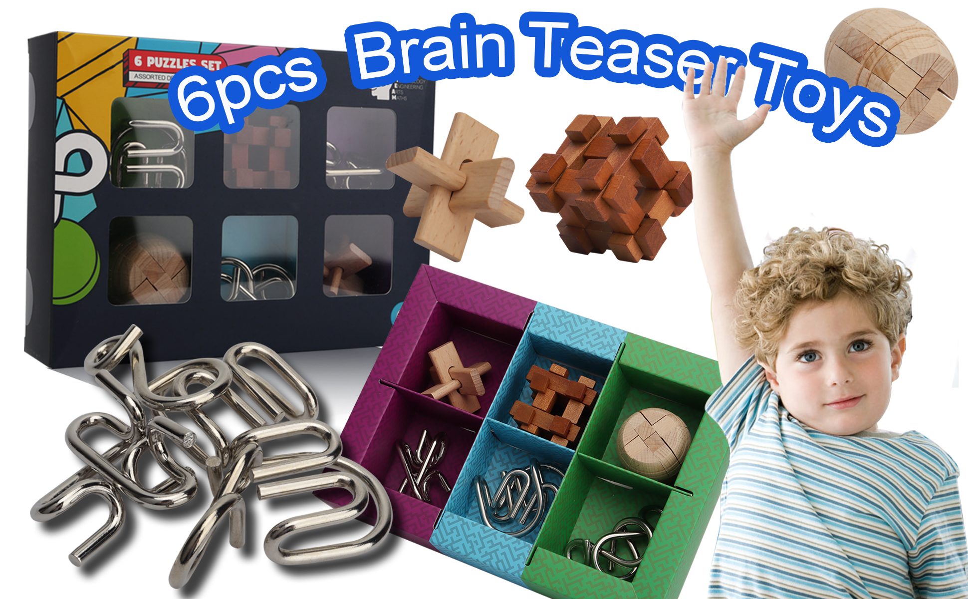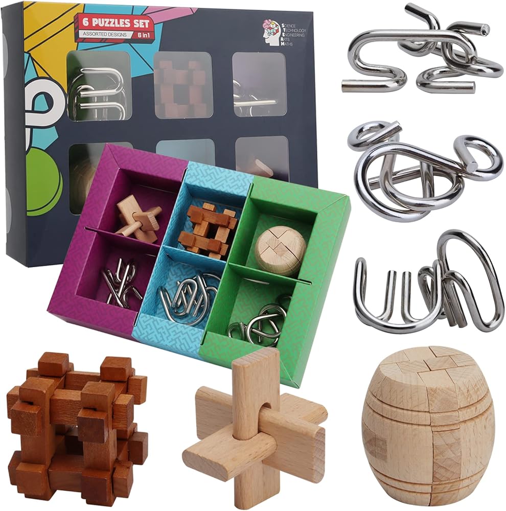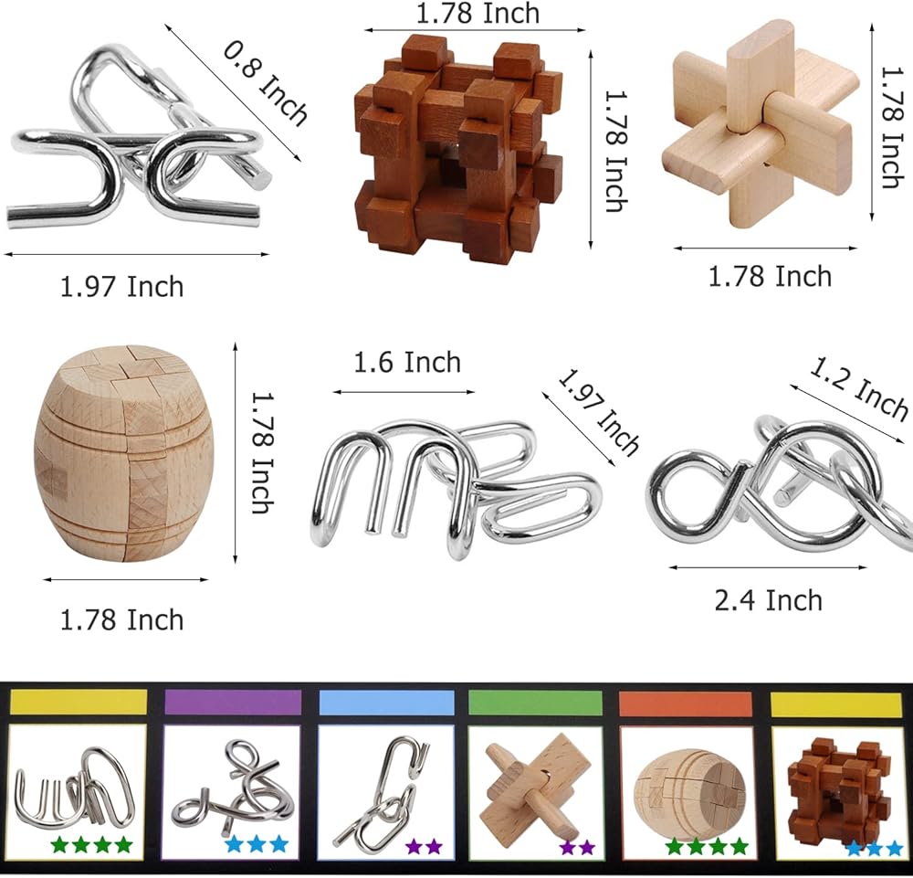 6 different Puzzles IQ toys with nice gift package box, include 3 Wooden Kong Ming Lock and 3 Iron Metal Puzzle, absolutely a great puzzles Challenging for kids and adults