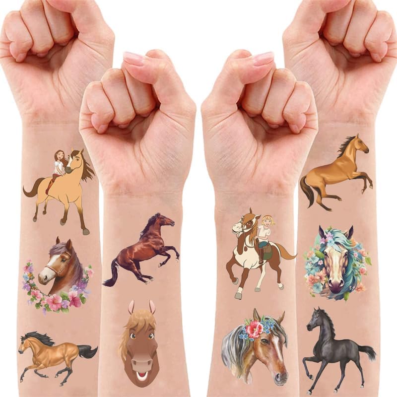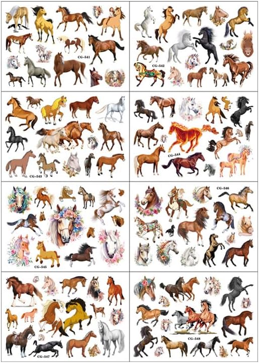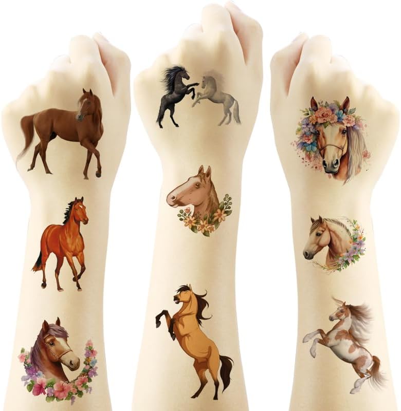 🌺【Horse Birthday Party Decorations】: Horse tattoos pertaining to our popular collection will accommodate children's expectations that they always look forward to having them at Birthday parties, Christmas, and special celebrations. Each tattoos set covers 8 sheets in total with 124 Pcs. The size of each tattoo sticker is 6.1*3.1 inches, one size fit for adults to kids. The numerous formed horse tattoos designed to different styles promising to develop the cute beauty for parties