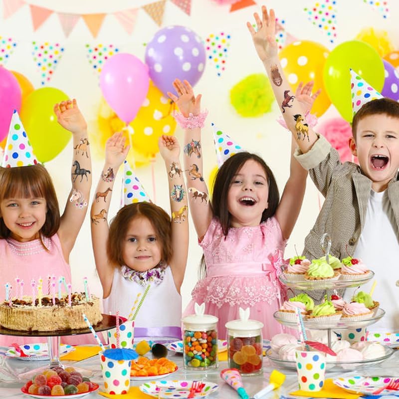 💗【Horse Party Favors Supplies】: Temporary tattoos horse arranged with a range of different horses will be the best preference for children at the party celebration. Horse birthday party featuring the existence of multiple horse tattoos stickers will help children feel like have an awesome experience of horse riding in their own birthday party. During the moments of party, children have no sadness at all replaced with the cheer plus excitement when they play with our tattoos