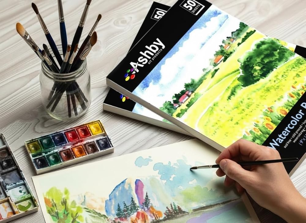 100 ورقة من ورق الألوان المائية من Ashby (9" x 12") - ثقيل (190GSM)، قطن 100%، خالي من الأحماض ومعصور على البارد. مثالية للرسم أو الرسم. مواد رطبة وجافة والمختلطة. بالك باك