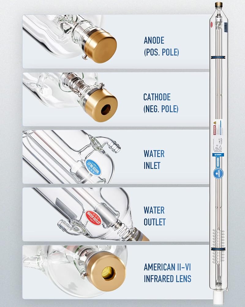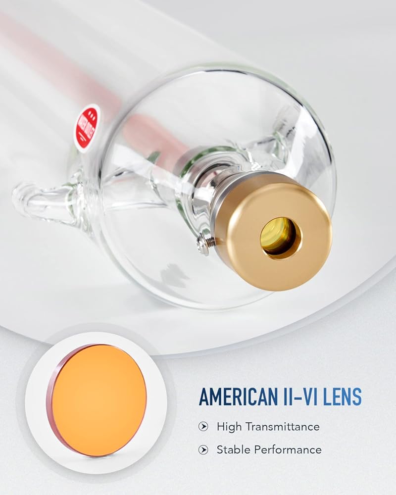 قطع فنية دقيقة: احصل على قطع دقيقة باستخدام آلات النقش والقطع بالليزر الخاصة بك مع أنبوب القطع بالليزر أحادي الوضع، والذي يتميز بنقطة شعاع مركزة 5 مم وعدسة الأشعة تحت الحمراء الأمريكية II-VI لتقليل توهين الضوء