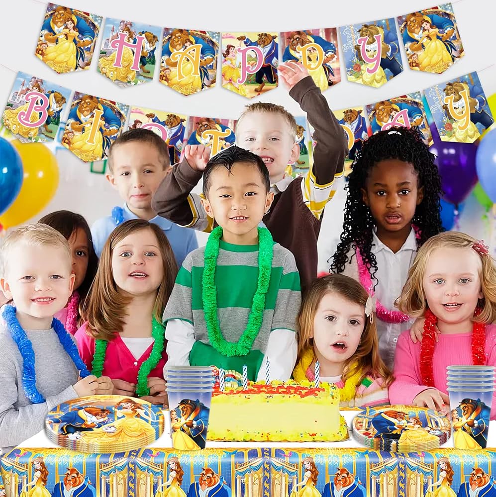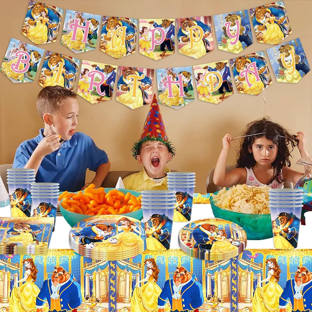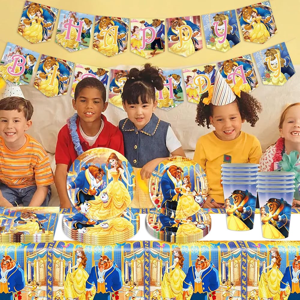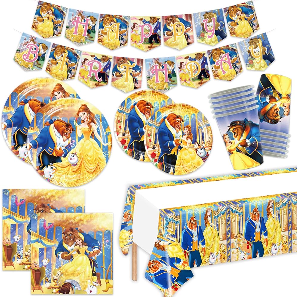 لوازم حفلات بيوتي آند ذا بيست - ديكورات عيد ميلاد بيوتي آند ذا بيست بما في ذلك اللافتات والأطباق والمناديل والأكواب وأغطية الطاولات لتزيين حفلات عيد ميلاد الأميرة (أصفر)