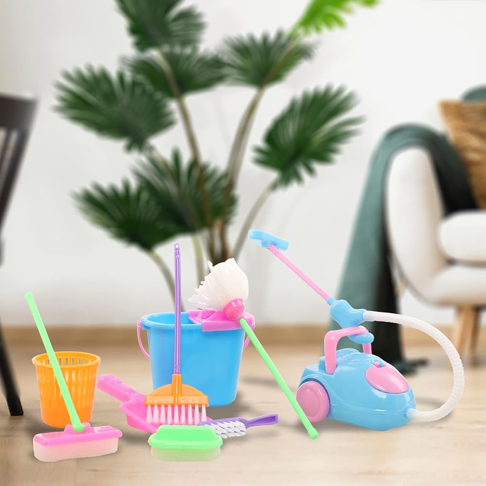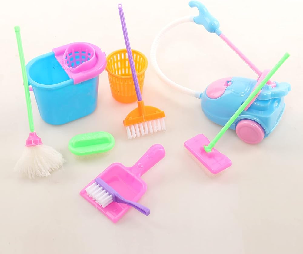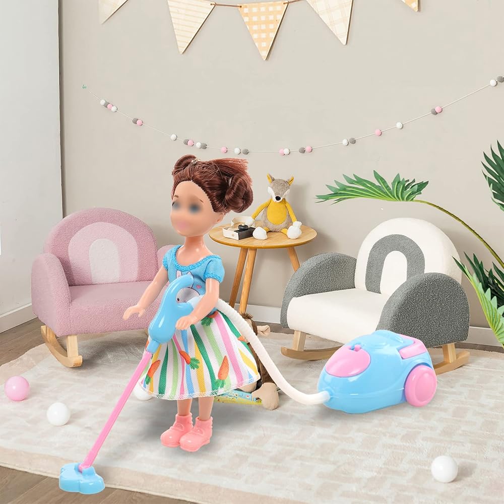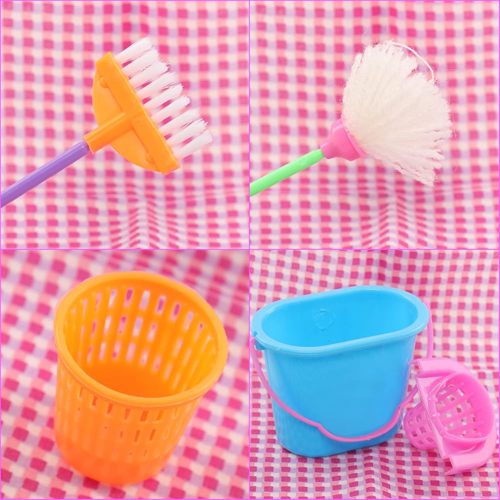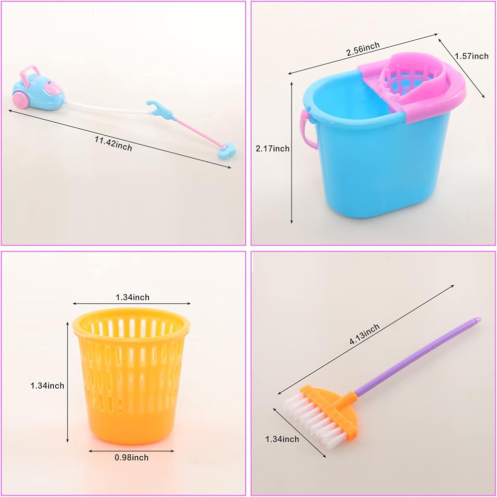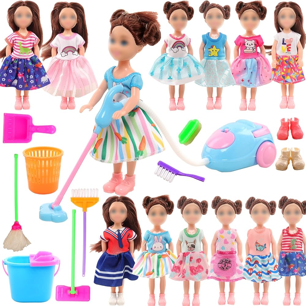 زي دمية فتاة عصرية: مناسب لدمية فتاة صغيرة مقاس 4-6 بوصة مع أدوات تنظيف أثاث بيت الدمى الصغيرة للأعمال المنزلية، ولعيد الميلاد، وعيد الأطفال، وأعياد الميلاد، والعطلات، والحفلات. ألوان زاهية، مليئة بأنماط المعيشة. هدية جميلة للطفل.