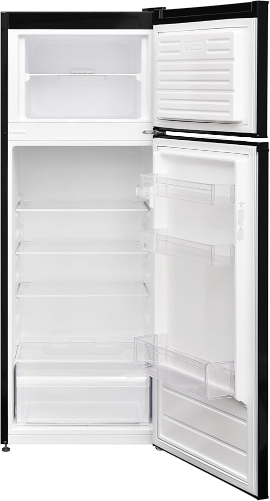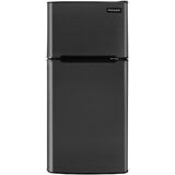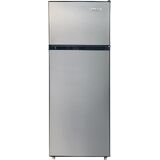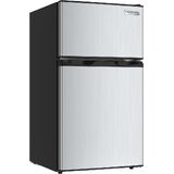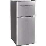3.2 cubic-foot refrigerator with clean stainless steel look, fridge and freezer, reversible door, clean stainless steel look, transparent vegetable drawer with glass shelf, adjustable thermostat, HCFC free, flush back space saving design, ice cube tray, slide out wire shelves