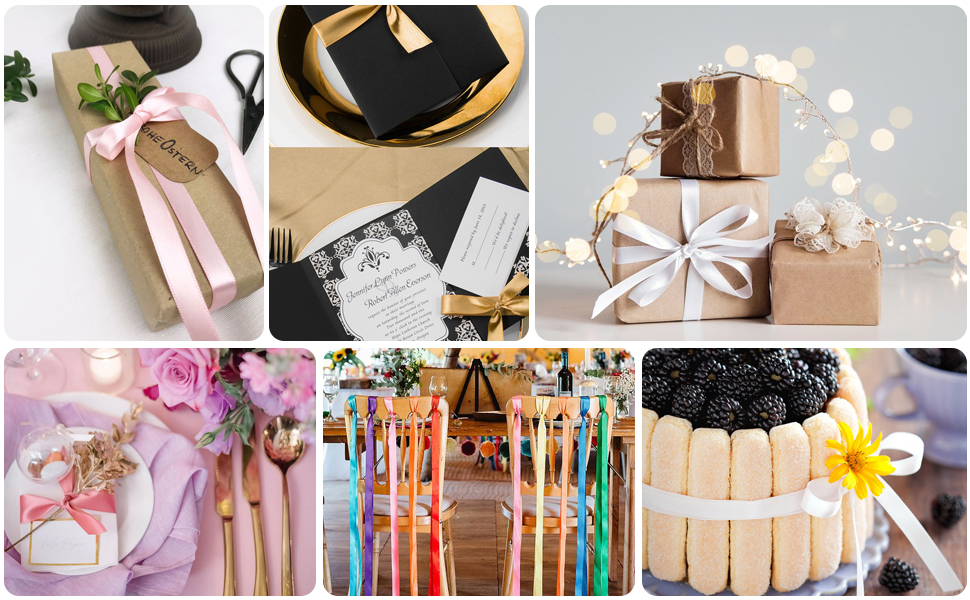 مجموعة واسعة من الاستخدامات - يمكن استخدام هذه الأشرطة تحت آلات الخياطة، وآلات التطريز، وآلات الحياكة، لذلك فهي لا تستخدم فقط في تصميم المشهد، والأقواس لتغليف الهدايا، وربطة عنق صندوق الهدايا، ولكن أيضًا في عصابات الشعر الجميلة، وإكسسوارات الشعر، حبل شعر مقوس، زينة بالونات، إلخ. يمكن نسجها في سوار الزفاف الفريد الخاص بك، أو صدار معصم وصيفة العروس، أو حزام تذكاري، أو بروش، أو شريط التخرج، أو زينة للحيوانات الأليفة، إلخ.