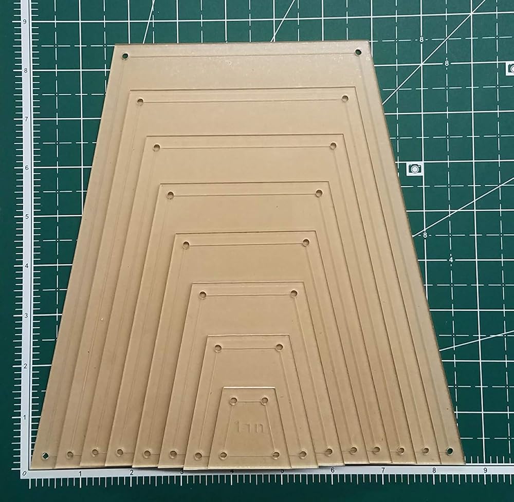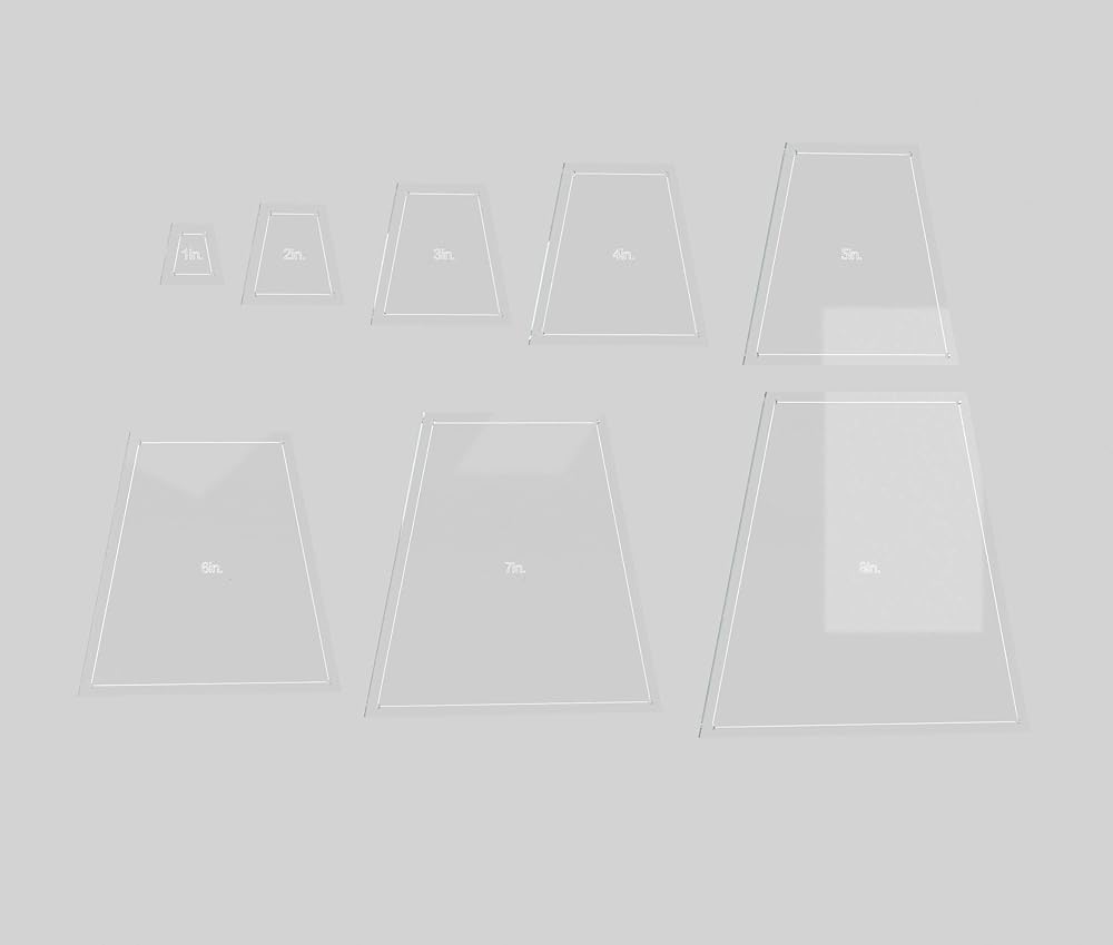 مجموعة قوالب مكعبات التبطين 8 انش و7 انش و6 انش و5 انش و4 انش و3 انش و2 انش و1 انش. هناك إمكانية درز مقاس 1/4 بوصة حول القالب والثقوب في الزوايا لسهولة وضع علامة على التماسك. مصنوعة من الأكريليك الشفاف 1/8 بوصة. يتم قطع قوالب الأكريليك هذه على قاطع ليزر، وهي جديدة ولكن قد يكون لها خدوش طفيفة من النقل والشحن. لا تتضمن عجلة القطع وبساط القطع والمسطرة. قد تختلف الكلمات المحفورة على القوالب. يتم شحن القوالب مع ورق خلفي يمكن إزالته بسهولة.