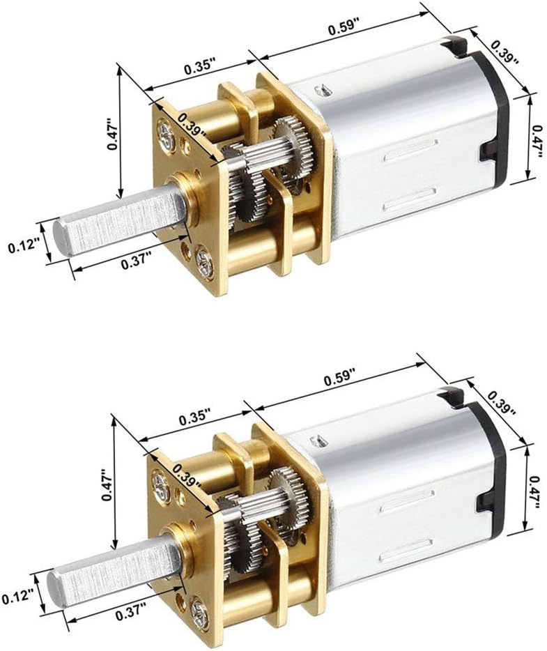 - حجم المحرك: 15 × 12 × 10 مم (الطول × العرض × الارتفاع)؛ حجم التروس: 9 × 12 × 10 مم (الطول × العرض × الارتفاع)