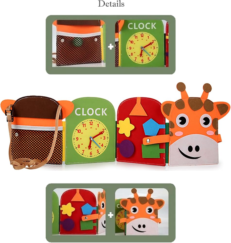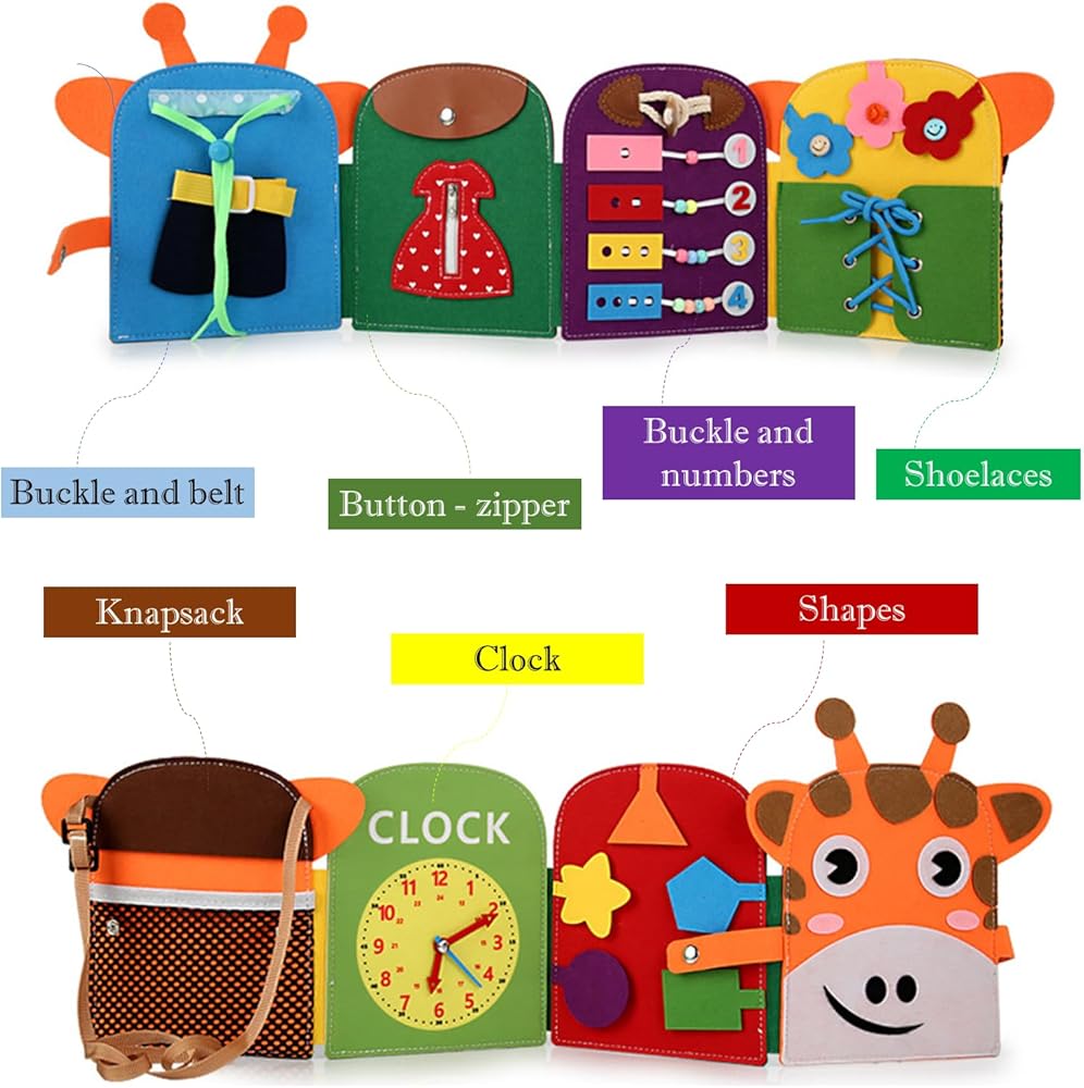 "كتاب مشغول على شكل زرافة يحتوي على 8 أنشطة لتنمية الانتباه والمهارات الحركية الدقيقة ومهارات الحياة اليومية. مثالي للأطفال فوق سن 3 سنوات أو الذين يحتاجون إلى أنشطة التكامل الحسي. مصنوع من مادة ناعمة وسهلة الحمل. جذاب تصميم للفتيان والفتيات."