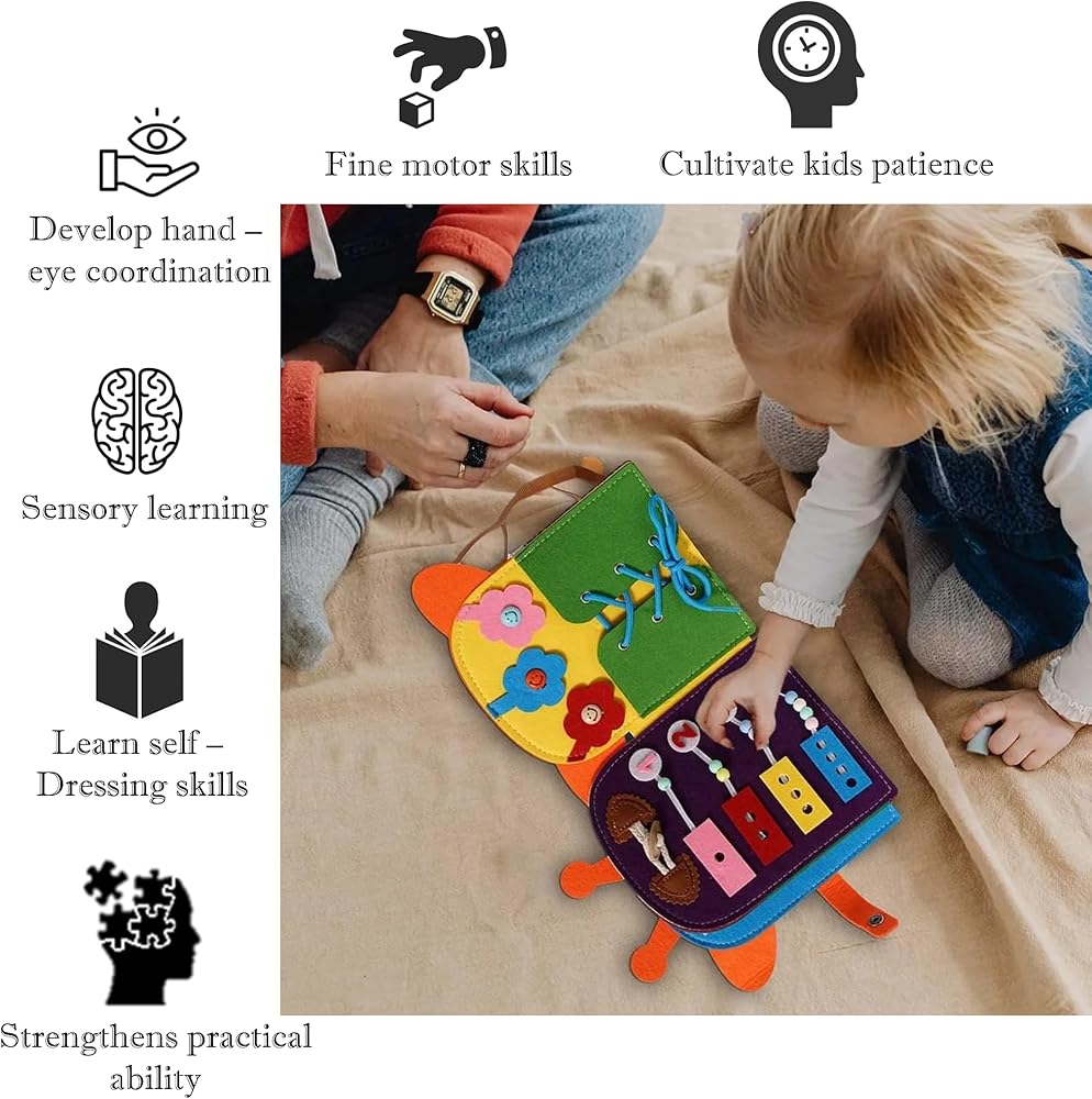 تم تصميم هذا الكتاب الحسي للأطفال الصغار لتعزيز تنمية المهارات الحركية الدقيقة لدى الأطفال الذين تزيد أعمارهم عن 3 سنوات والأطفال الذين يعانون من صعوبات في التكامل الحسي أو الحركي.