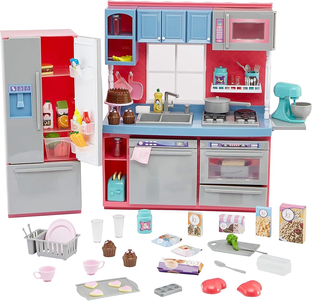 تتميز مجموعة المطبخ المتينة بموقد تظاهري وفرن وحوض وغسالة صحون وثلاجة، وتتضمن أكثر من 100 قطعة لعب ملحقة.