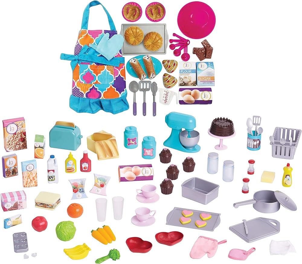 تتضمن قطع اللعب الملحقة: خلاط ووعاء خلط وكوب قياس ومجموعة ملاعق قياس وملعقة وزعنفة وعلبة وصينية خبز الكعك وصينية خبز الكب كيك والنظارات والأطباق والكب كيك والكوكيز والمئزر وقبعة الشيف وقفاز الفرن ووصفة الكب كيك.