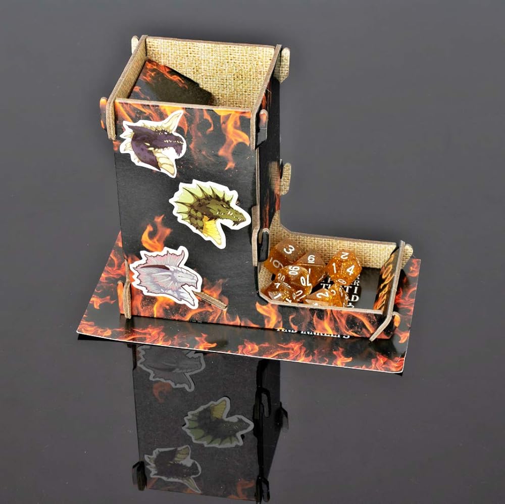 مجموعة برج النرد مطبوعة بتصميم فاير دي ان دي دايس رولر مع ملصقات دراجون لالعاب ار بي جي وام تي جي ودي اند دي باثفايندر