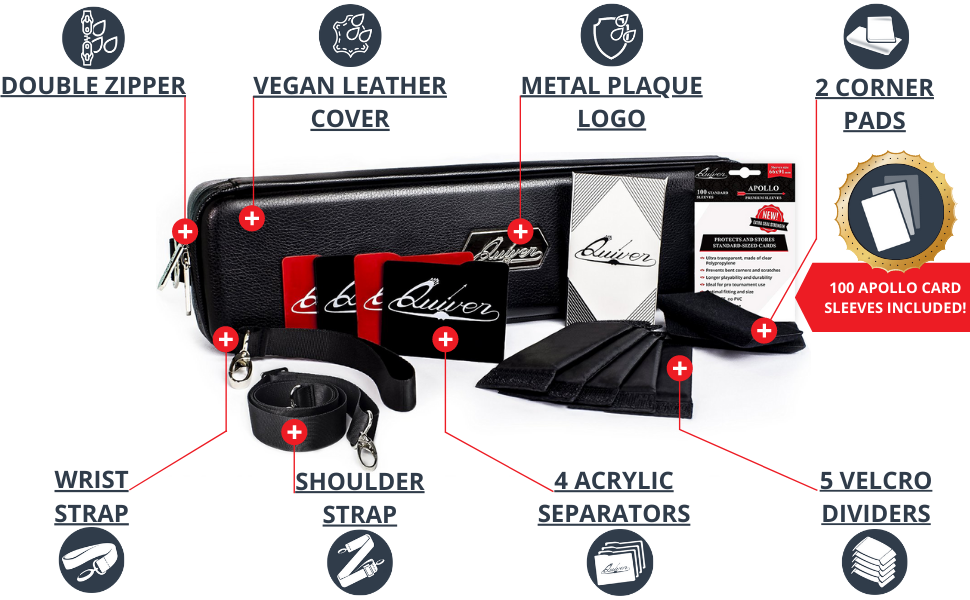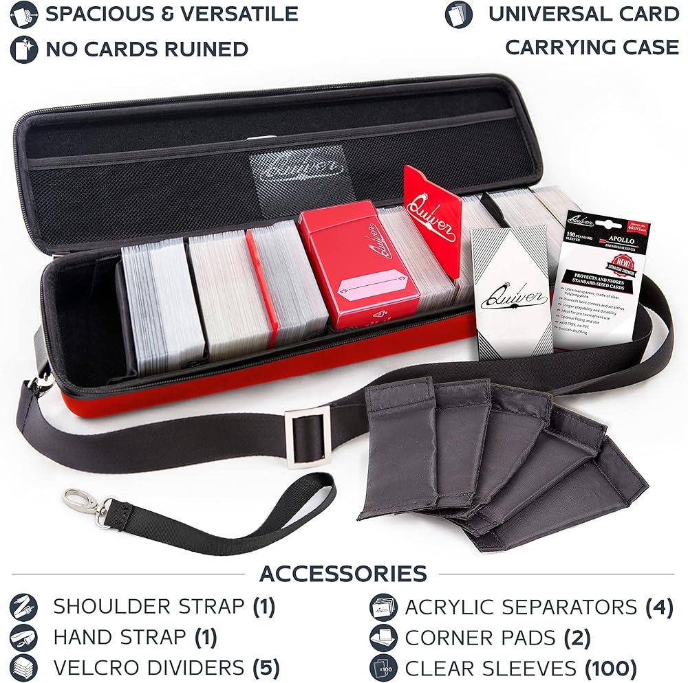 حافظة صندوق بطاقات مميزة: تحتوي حافظة حامل بطاقات Quiver الخاصة بك على أكثر من 1350 بطاقة لعب بدون أكمام، وتتضمن فاصلين أكريليك قويين، و3 فواصل فيلكرو و2 وسادات زاوية قابلة للإزالة لفرز وتخزين البطاقات أو الأسطح.